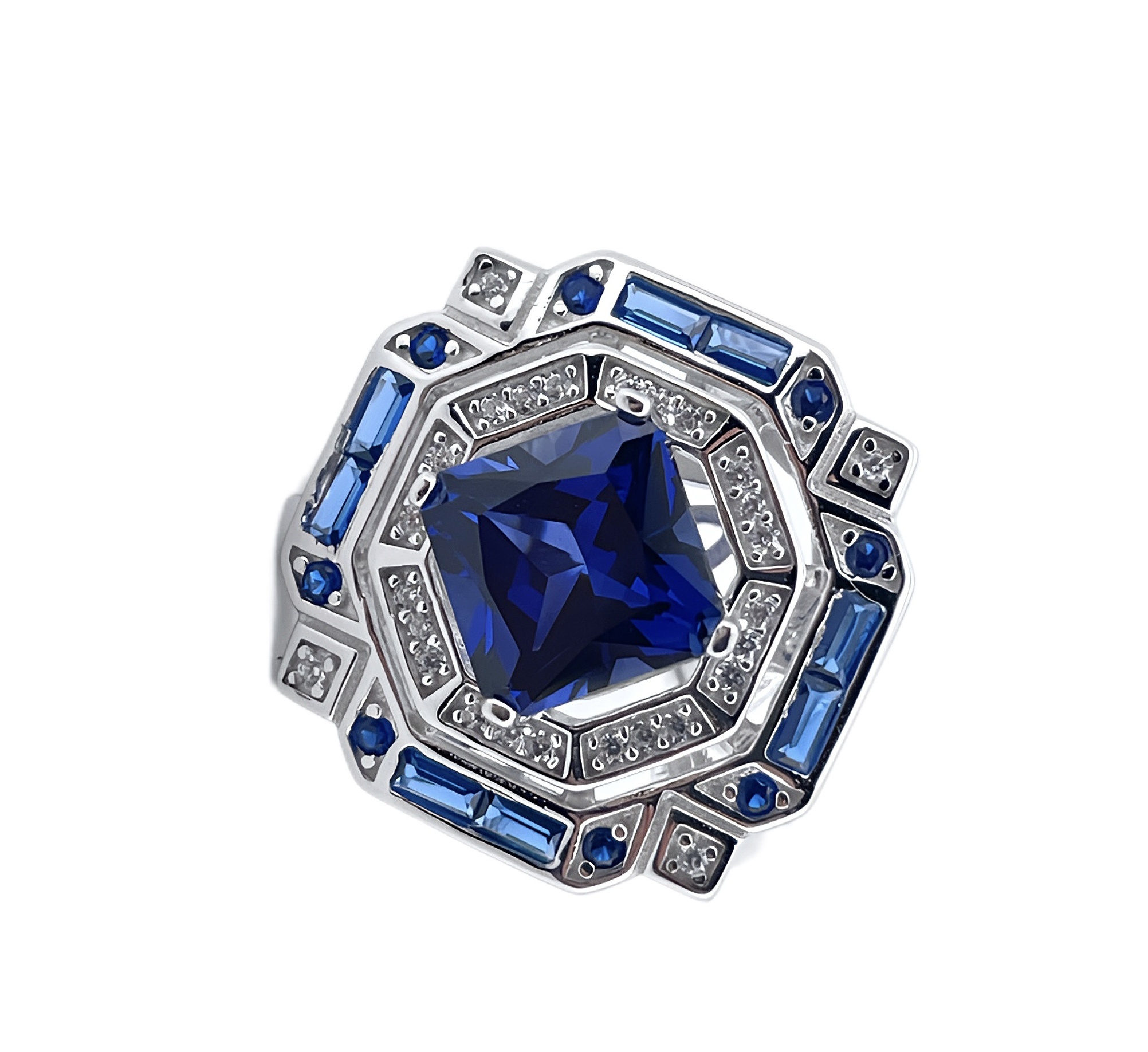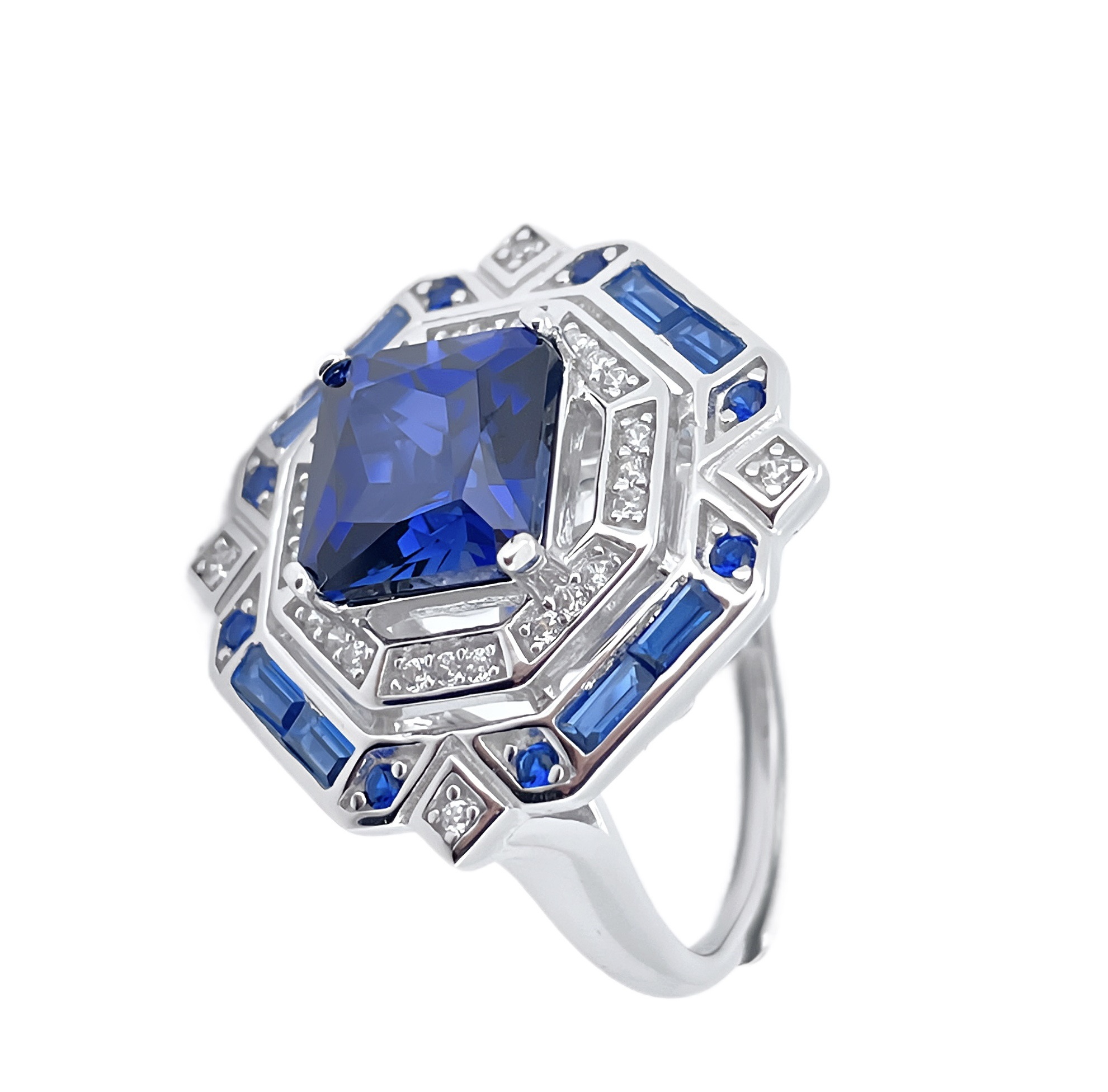 设计巧思:采用 “多层几何镶钻 + 蓝宝点缀” 设计,将公主方蓝宝的规整轮廓与银戒的艺术线条融合,小众设计极具辨识度,是指尖的吸睛焦点。