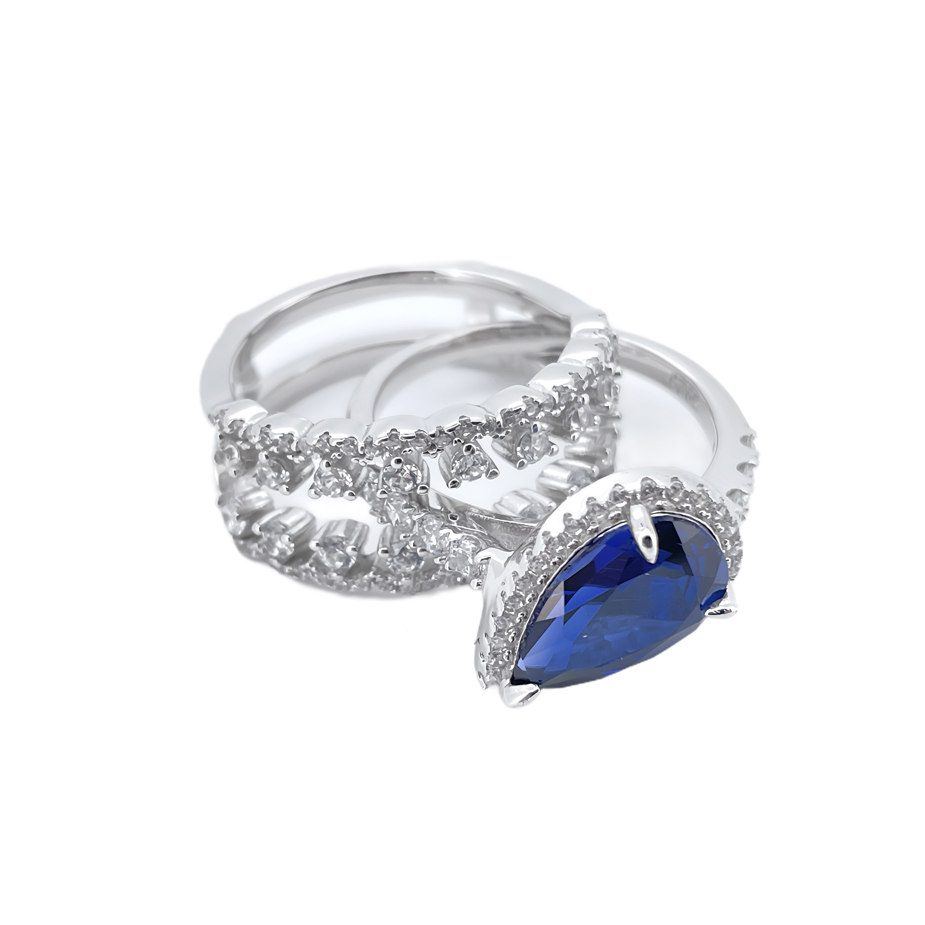 水滴蓝宝切割工整,叠戒镶钻工艺精湛,钻饰与宝石交相辉映,让戒指在光线下时刻绽放 “叠戴高定” 的魅力。