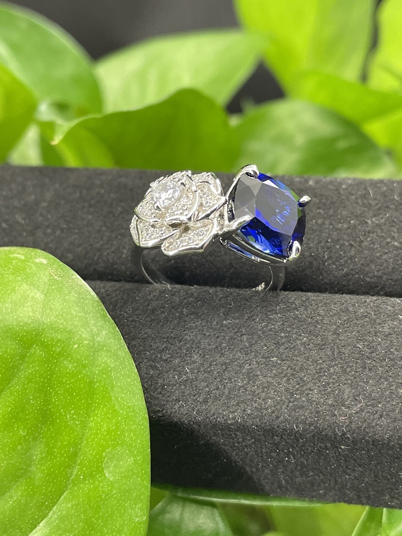 宝石魅力:主石为 5.49CT 培育蓝宝石,枕形切割色泽浓郁深邃,火彩饱满绚烂,搭配 “钻石玫瑰” 艺术设计,复刻天然蓝宝石的高级质感,每一次佩戴都如指尖绽放浪漫花束,尽显轻奢高定气场。