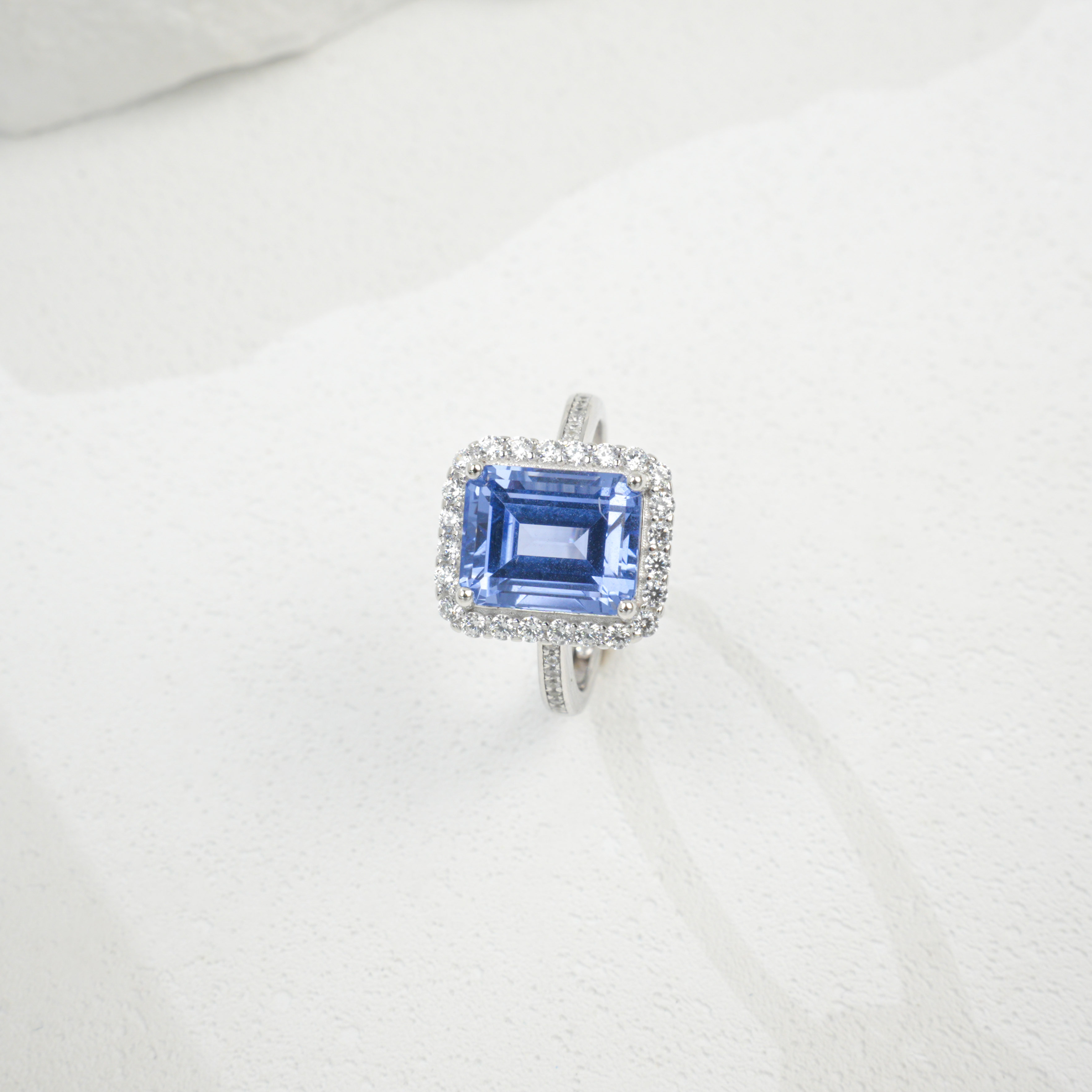 宝石魅力:主石为 8×10MM/5.12CT 矢车菊色培育蓝宝石,祖母绿切割色泽清新雅致,火彩饱满绚烂,搭配 “满钻围镶” 设计,复刻天然矢车菊蓝宝石的高级质感,每一次佩戴都尽显轻奢高定气场。