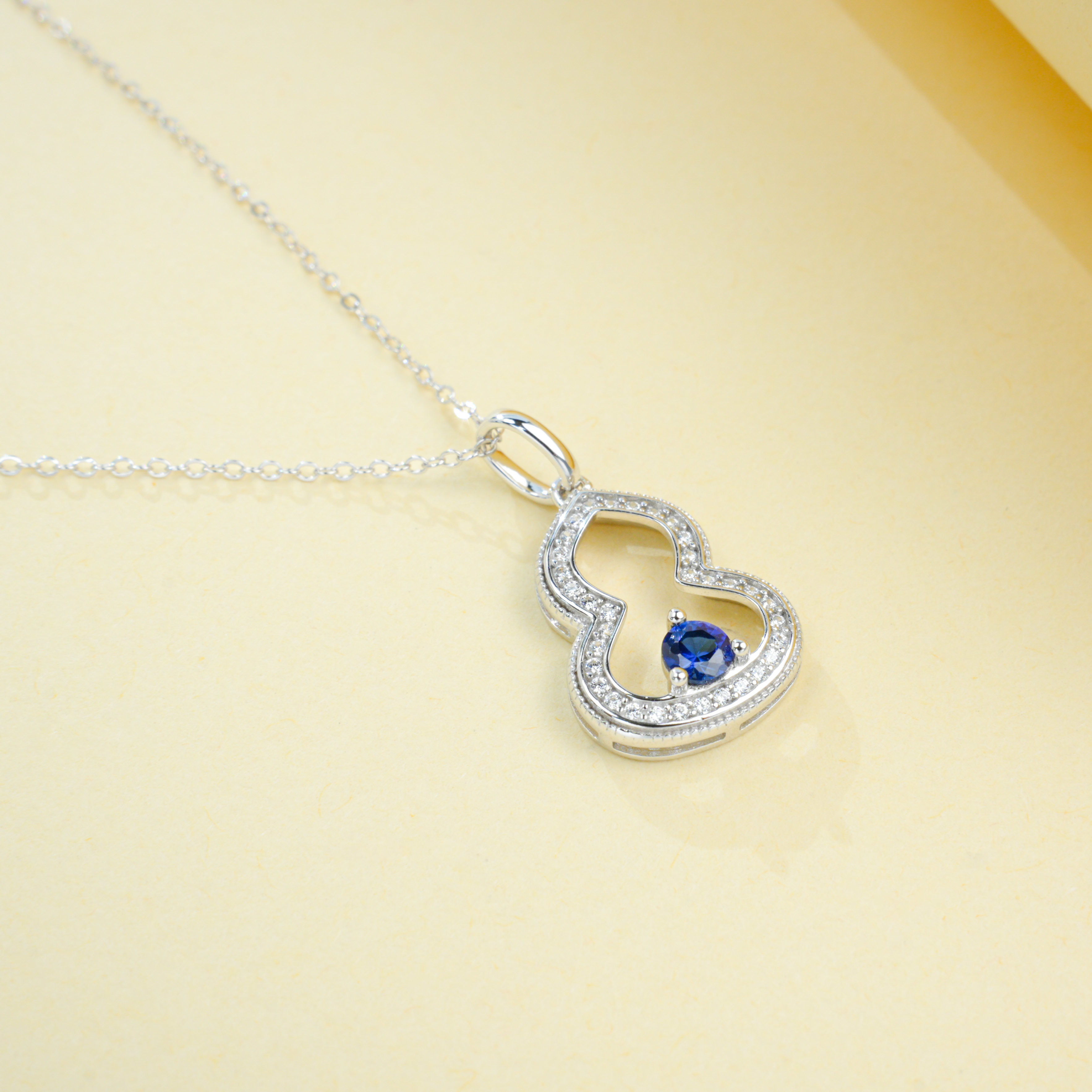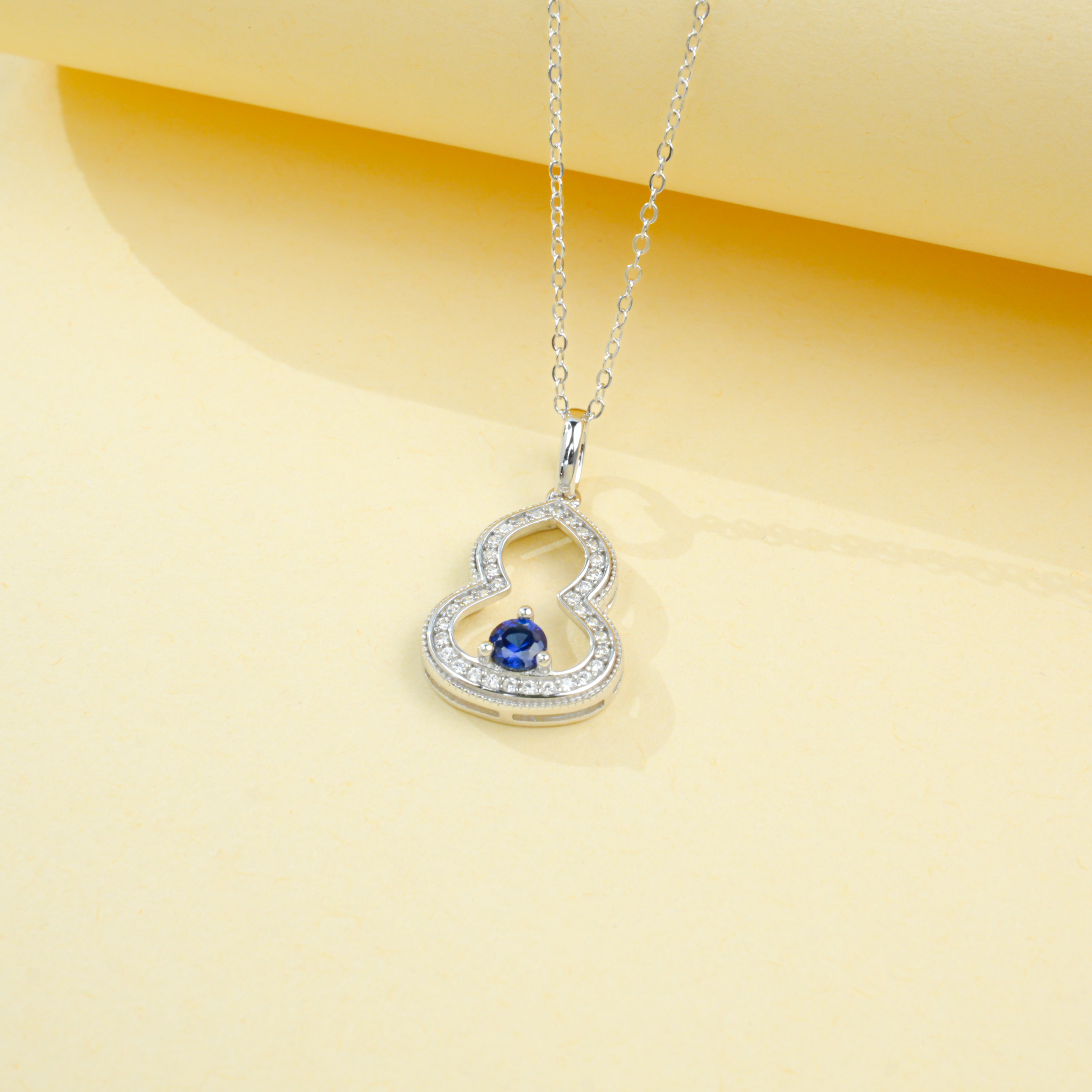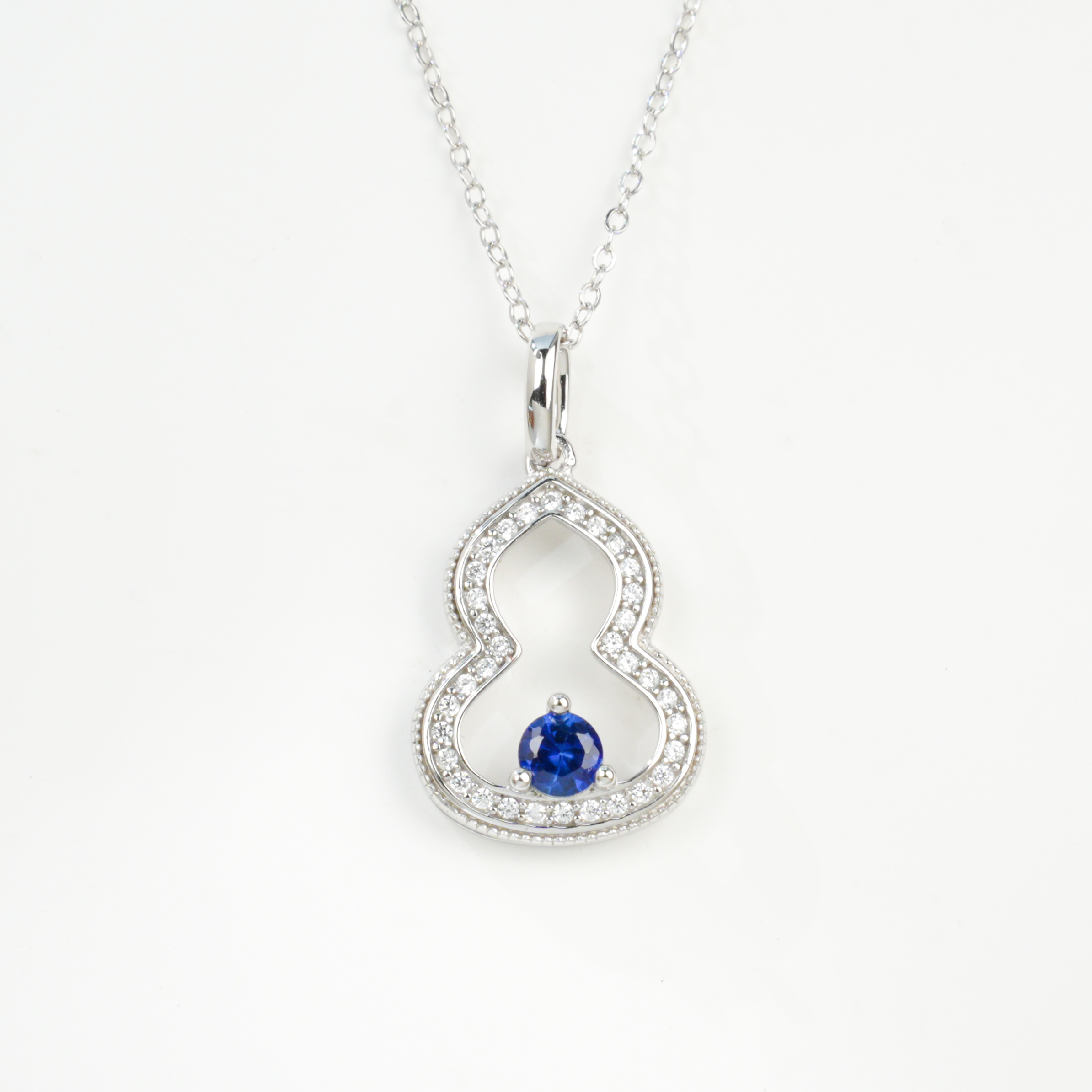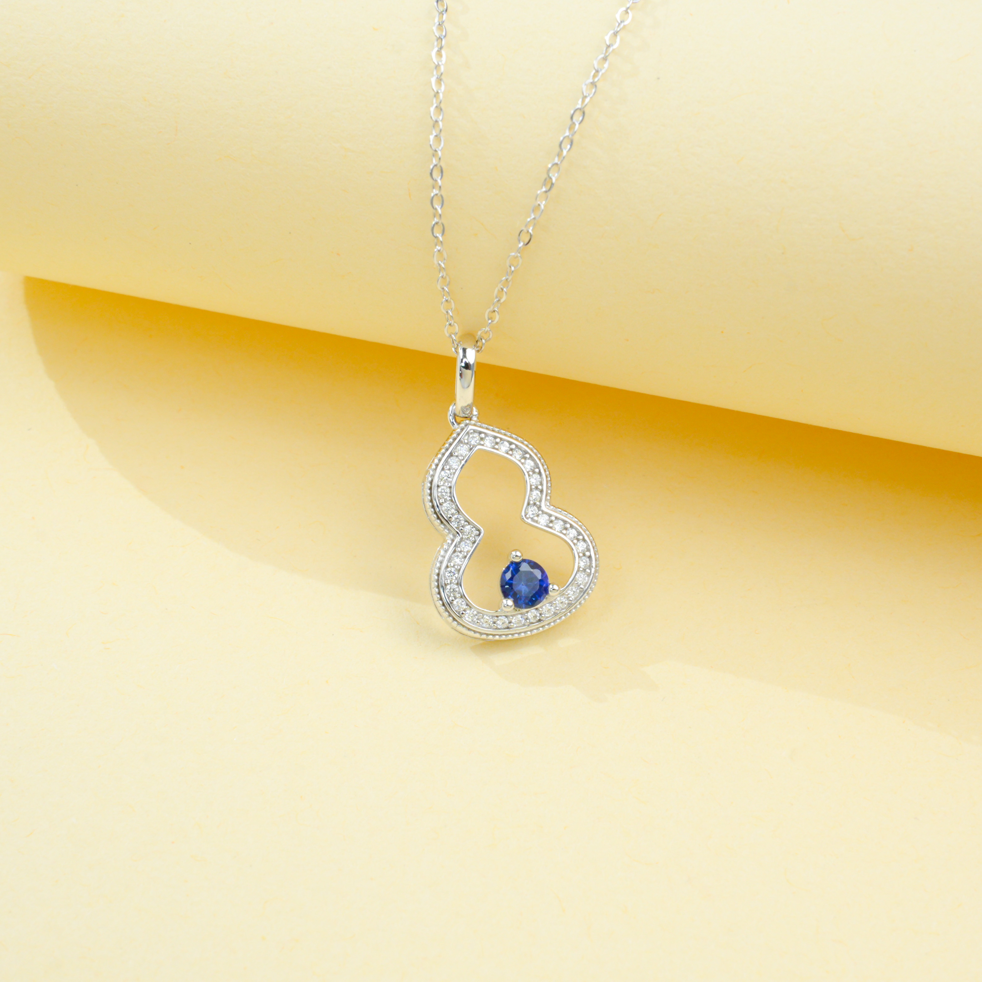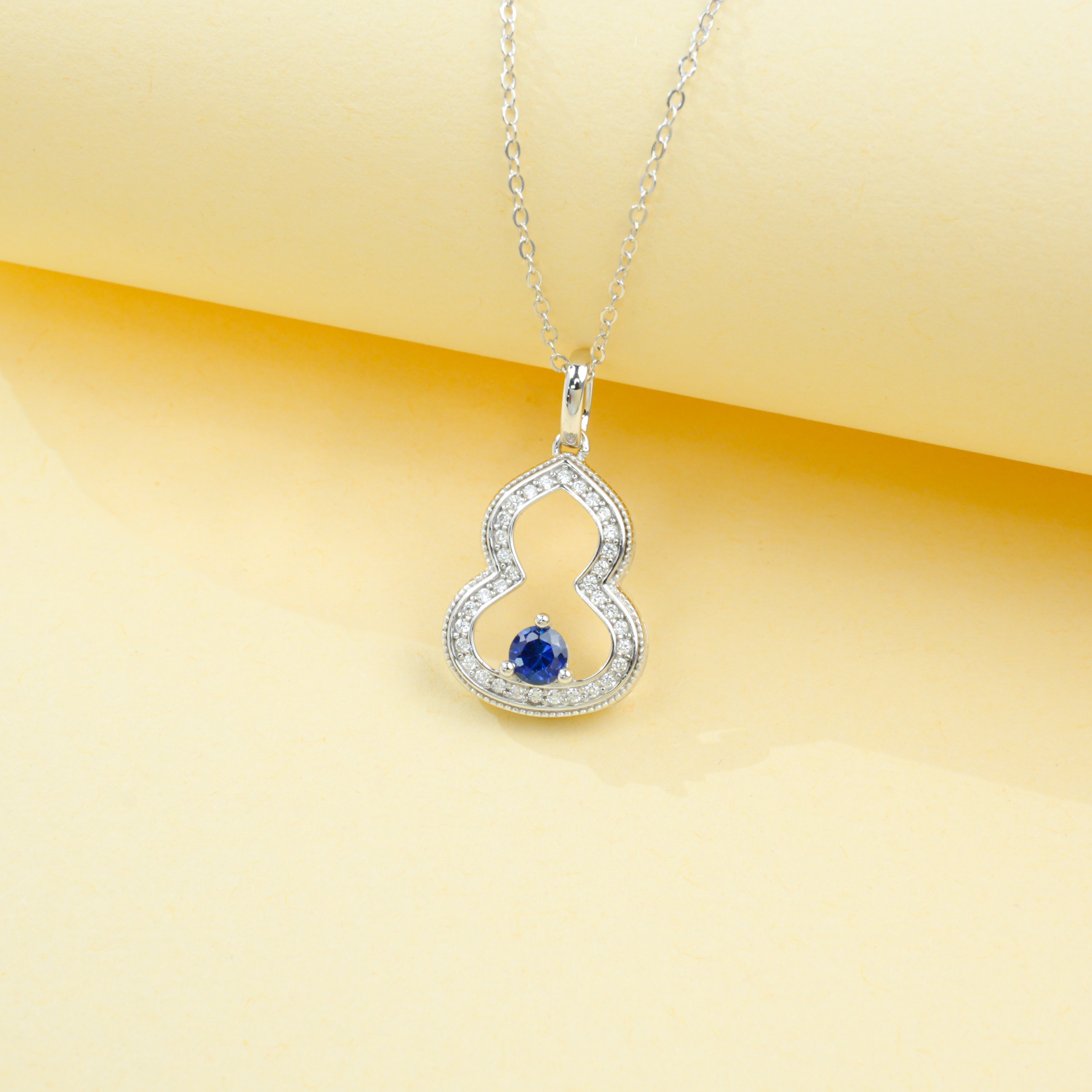 宝石魅力:主石为 4×4MM 培育蓝宝石,圆形切割色泽浓郁深邃,火彩饱满绚烂,搭配 “葫芦满钻镶饰” 设计,复刻天然蓝宝石的高级质感,融合国风葫芦元素,寓意福禄双全,每一次佩戴都尽显颈间轻奢国风气场。