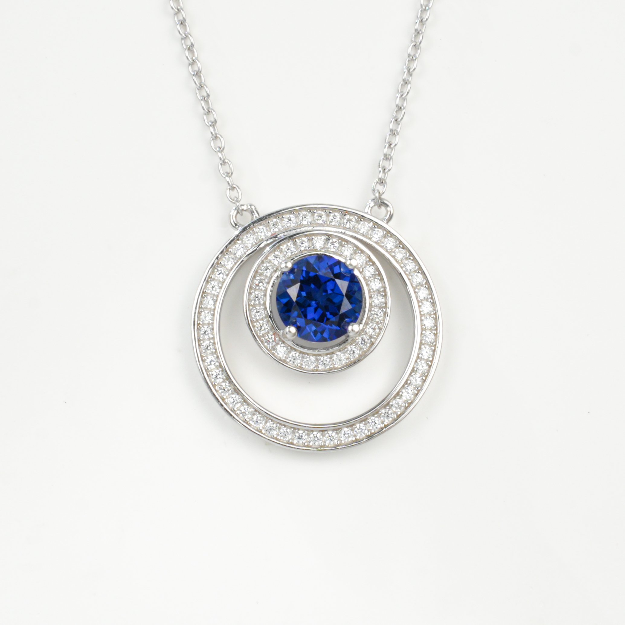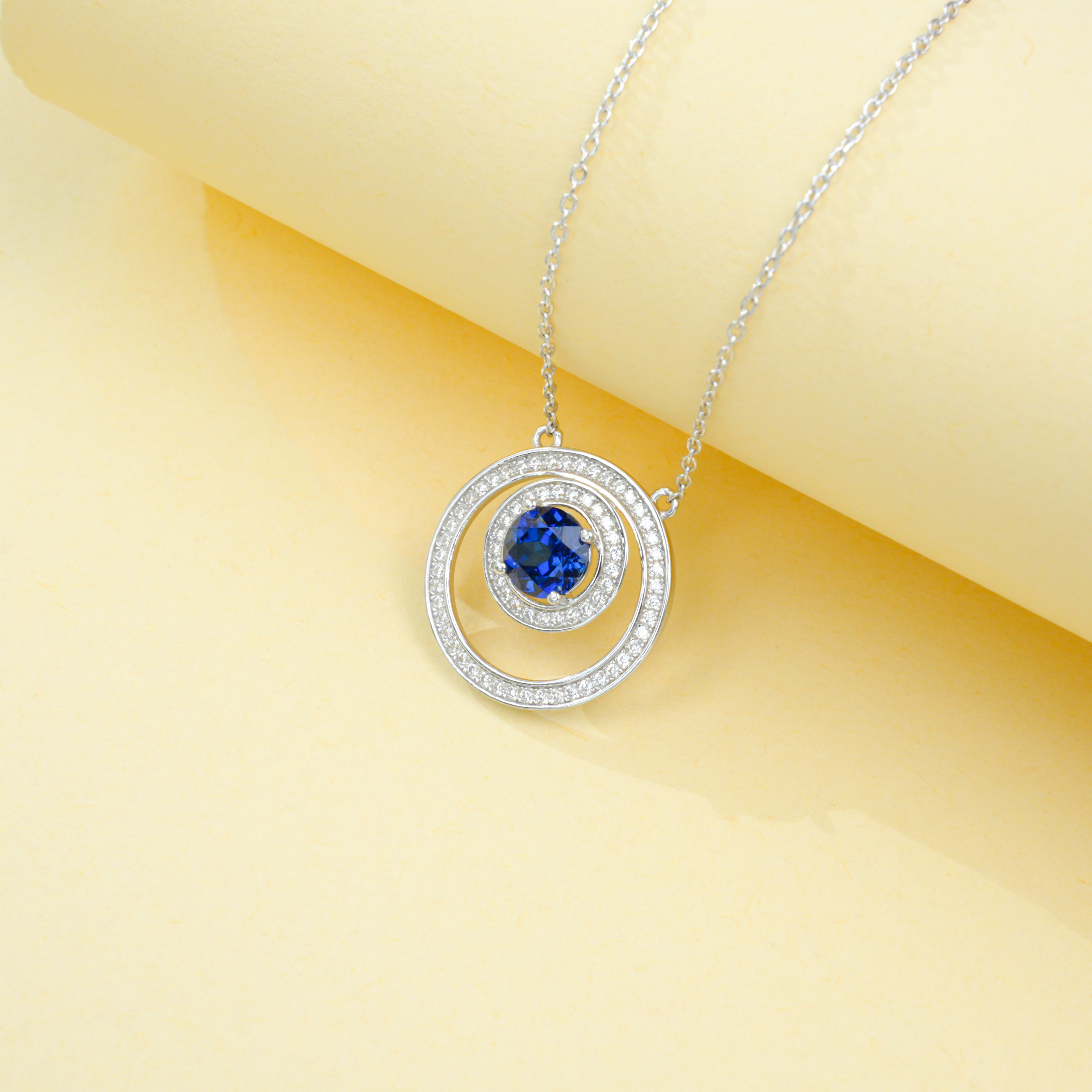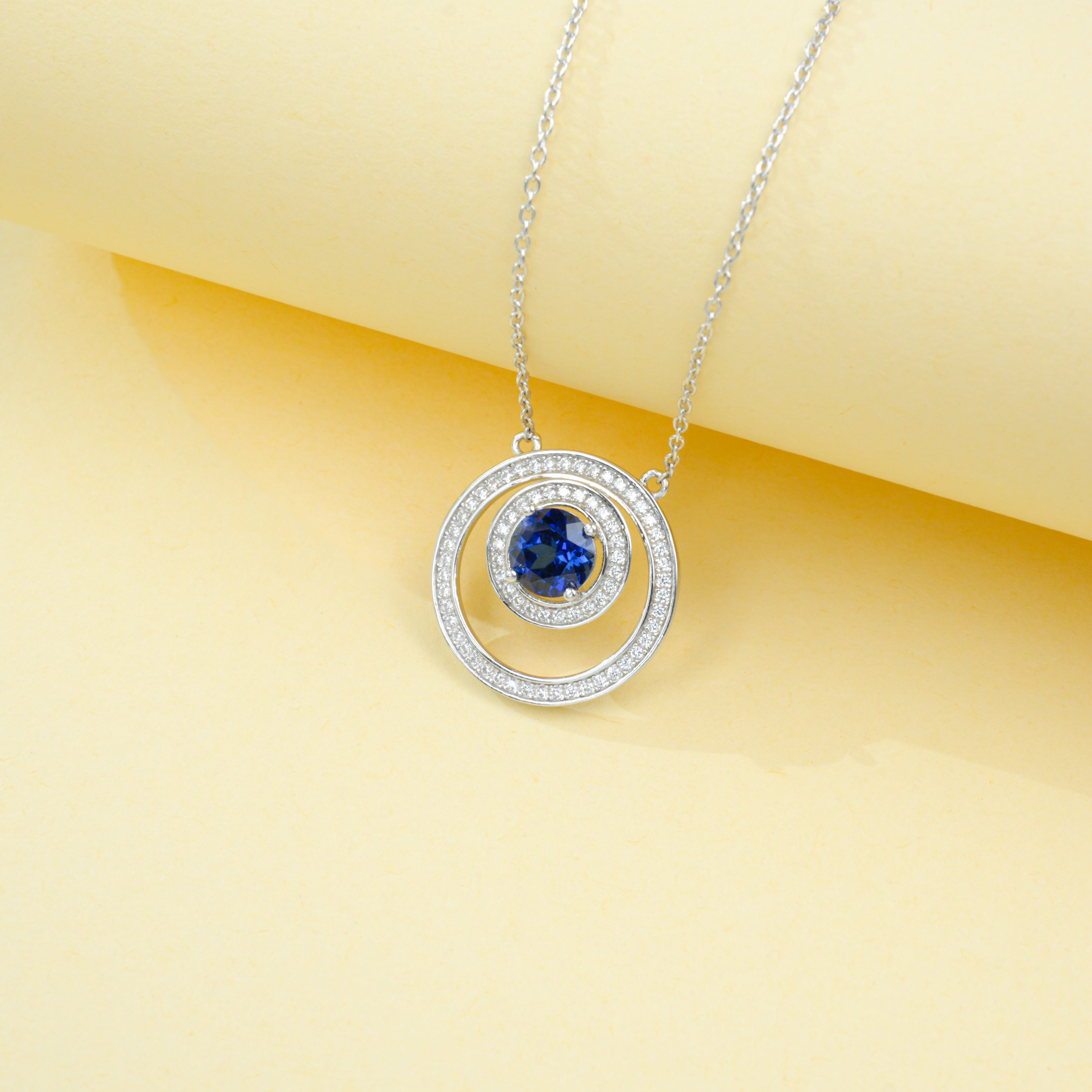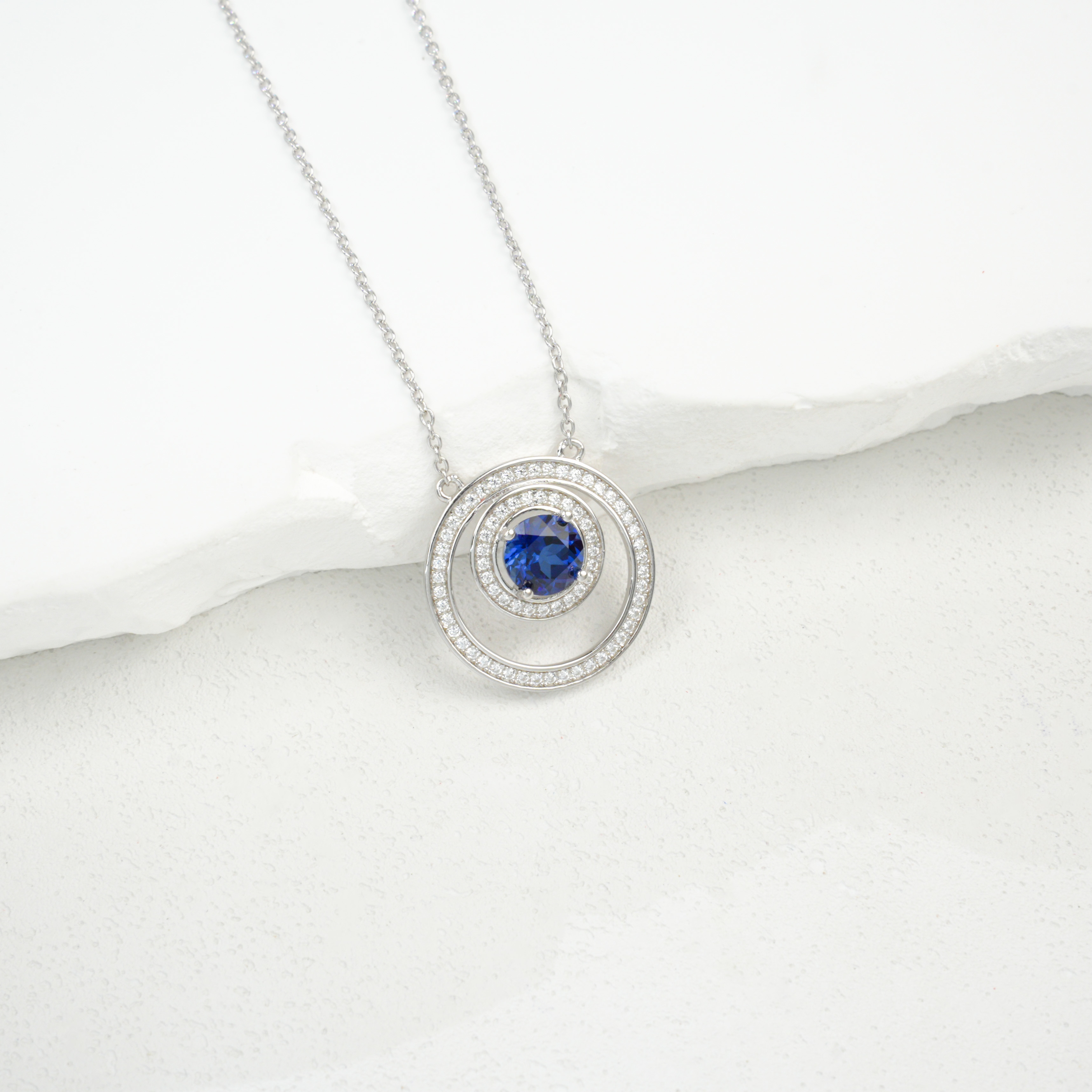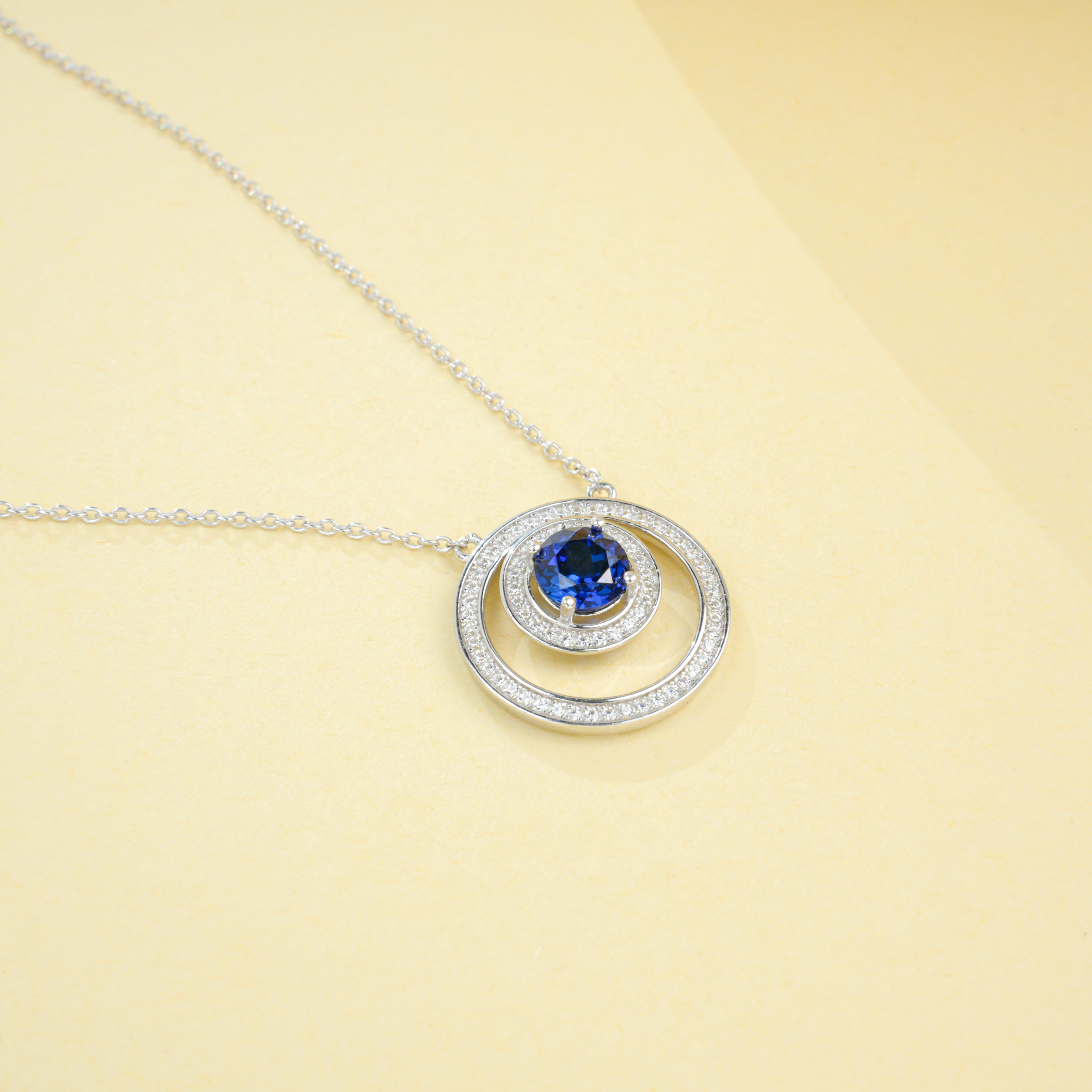 宝石魅力:主石为 6.5MM/1.41CT 培育蓝宝石,圆形切割色泽浓郁深邃,火彩饱满绚烂,搭配 “双层圆环满钻镶饰” 设计,复刻天然蓝宝石的高级质感,每一次佩戴都如颈间凝聚艺术焦点,尽显轻奢高定气场。