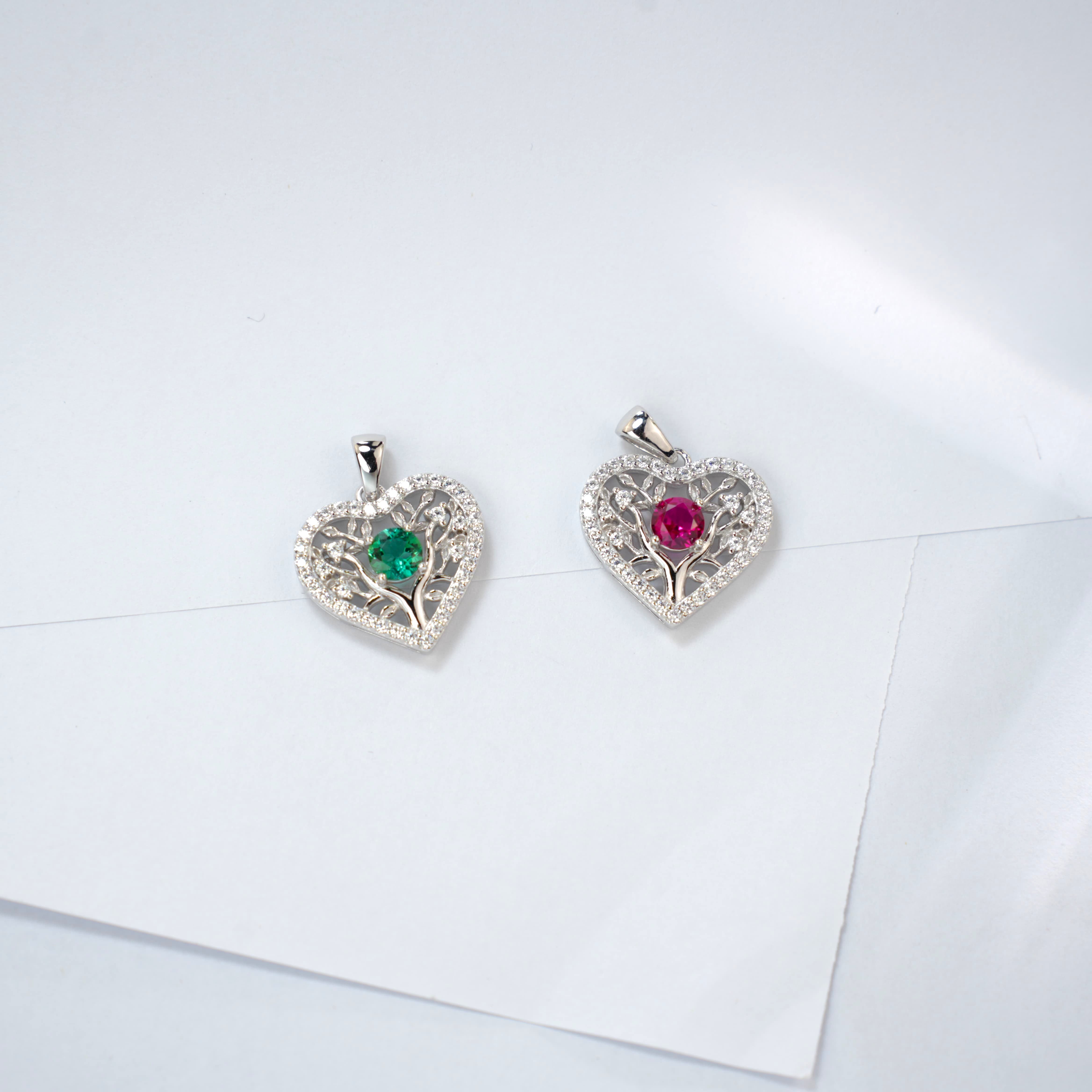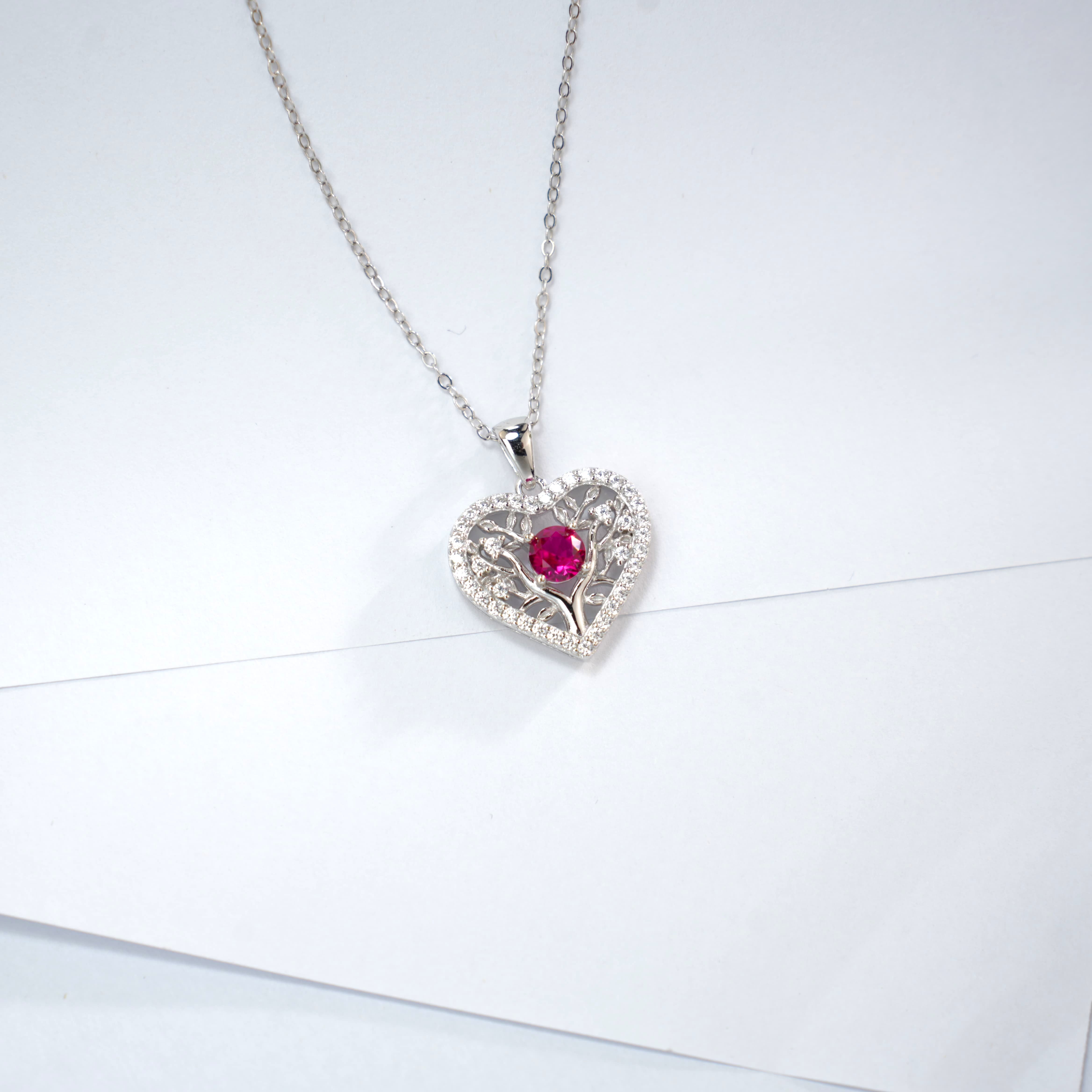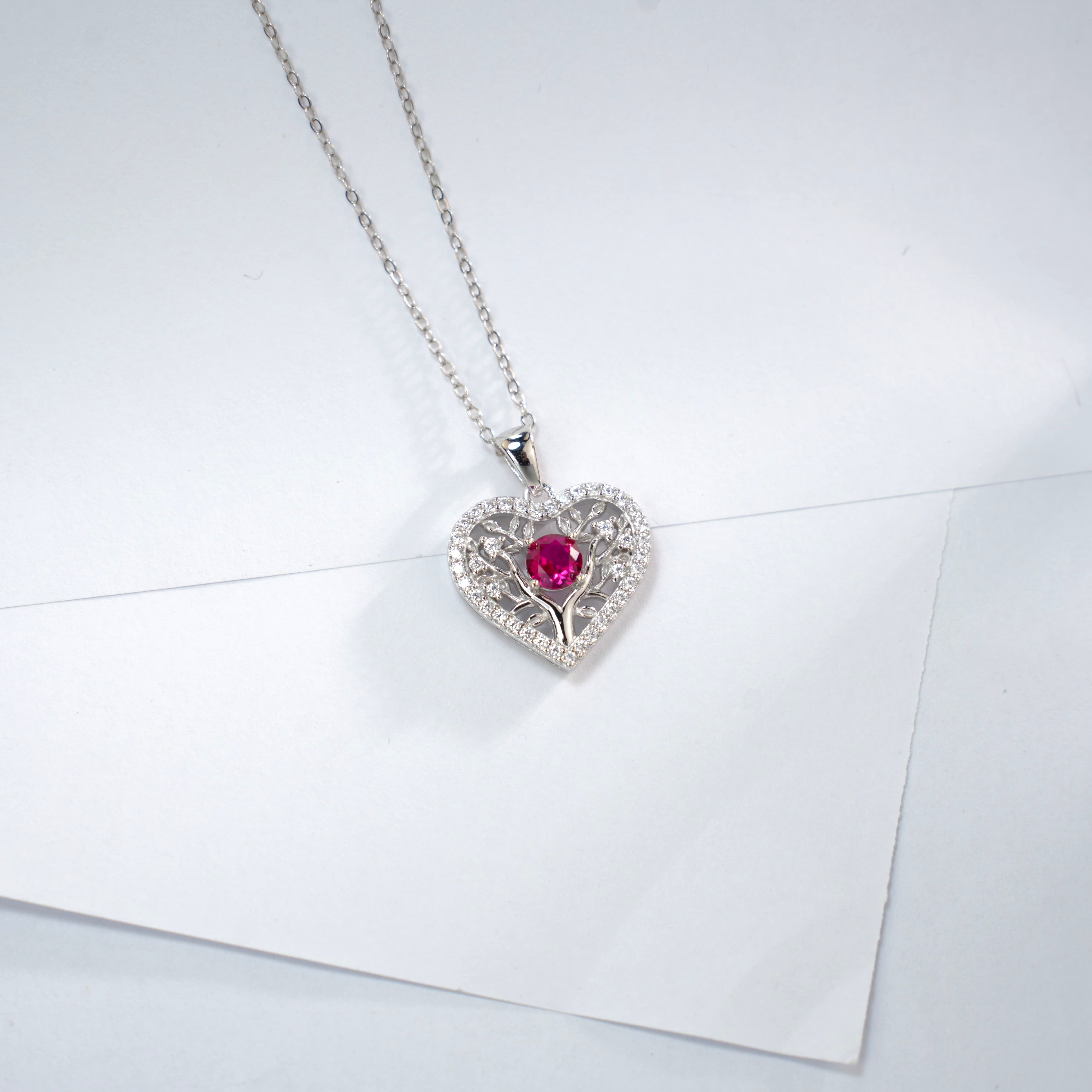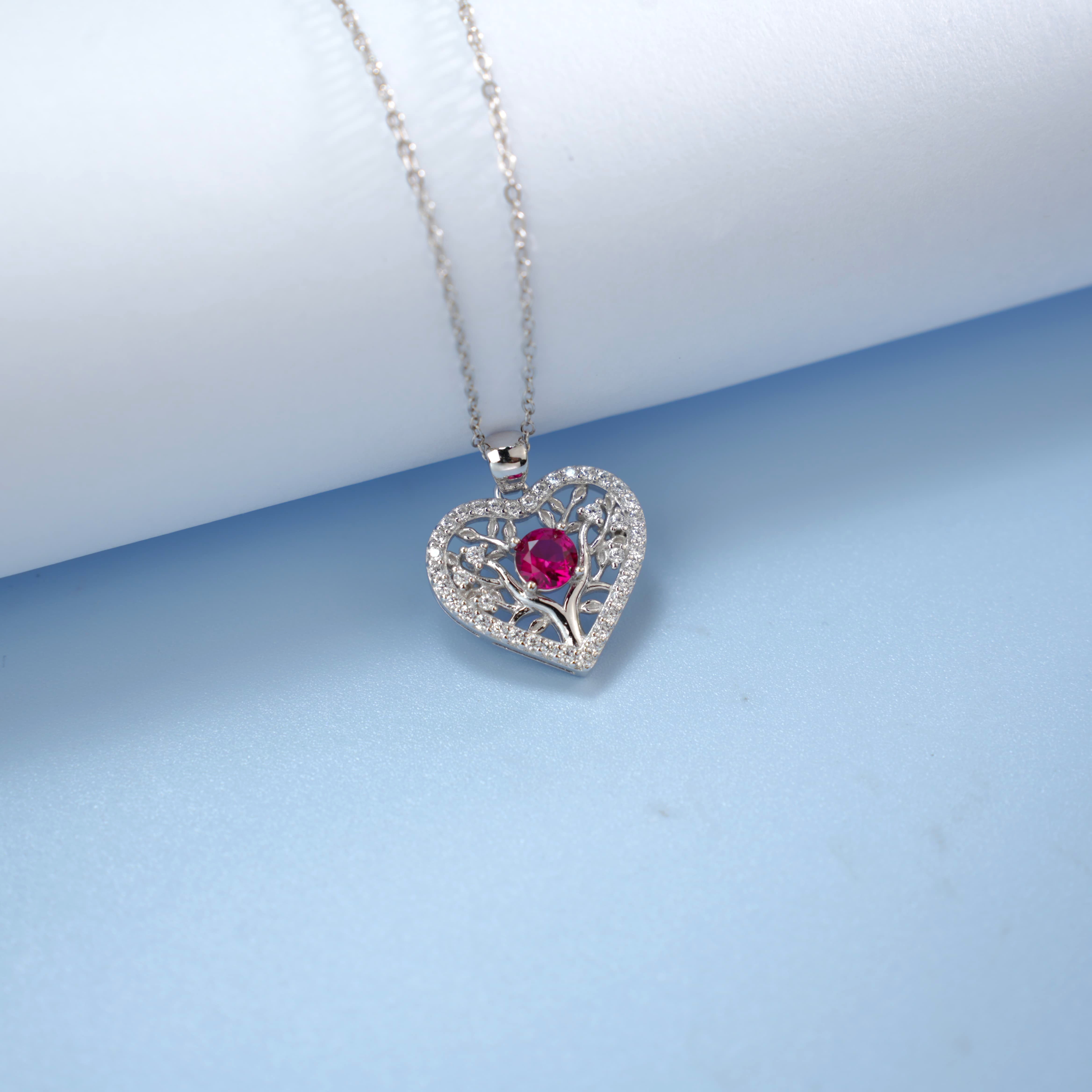 925 银培育红宝爱心生命树项链