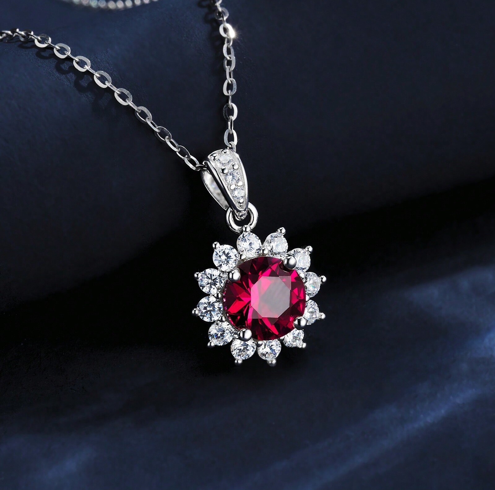925 银培育红宝太阳花项链