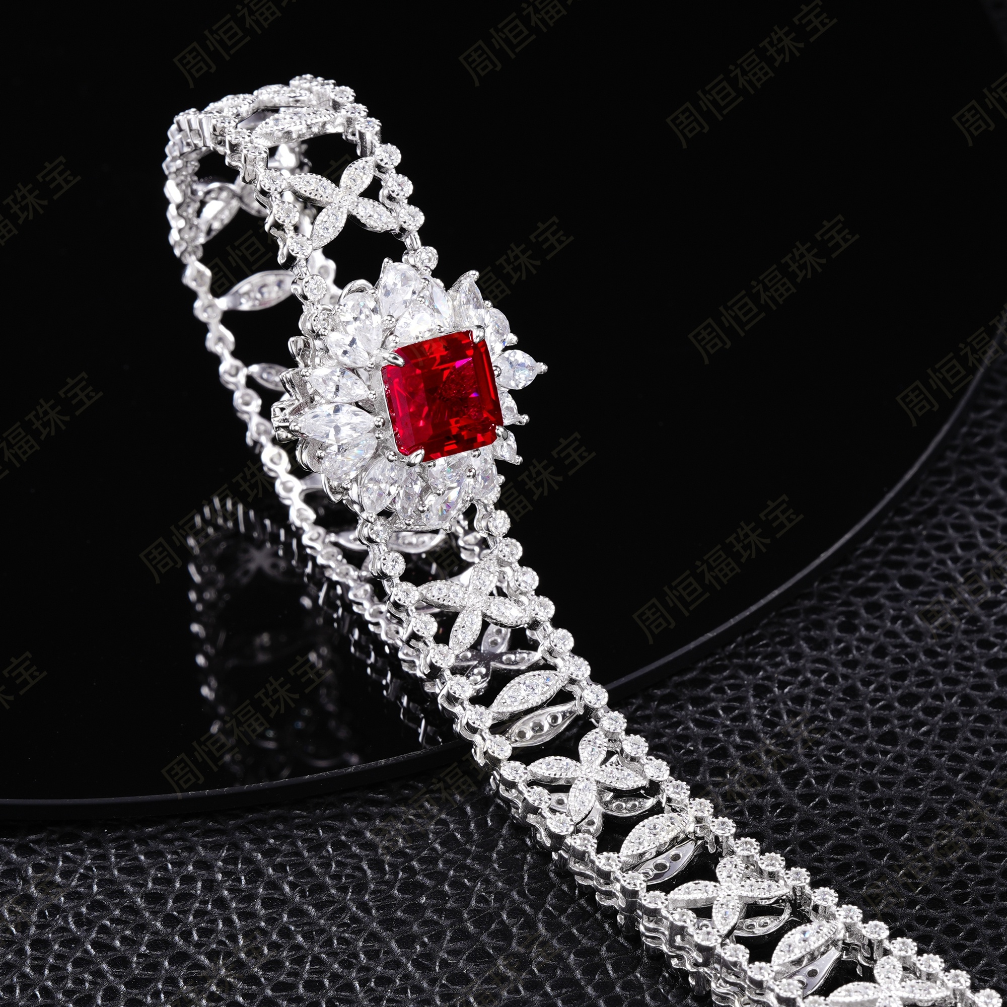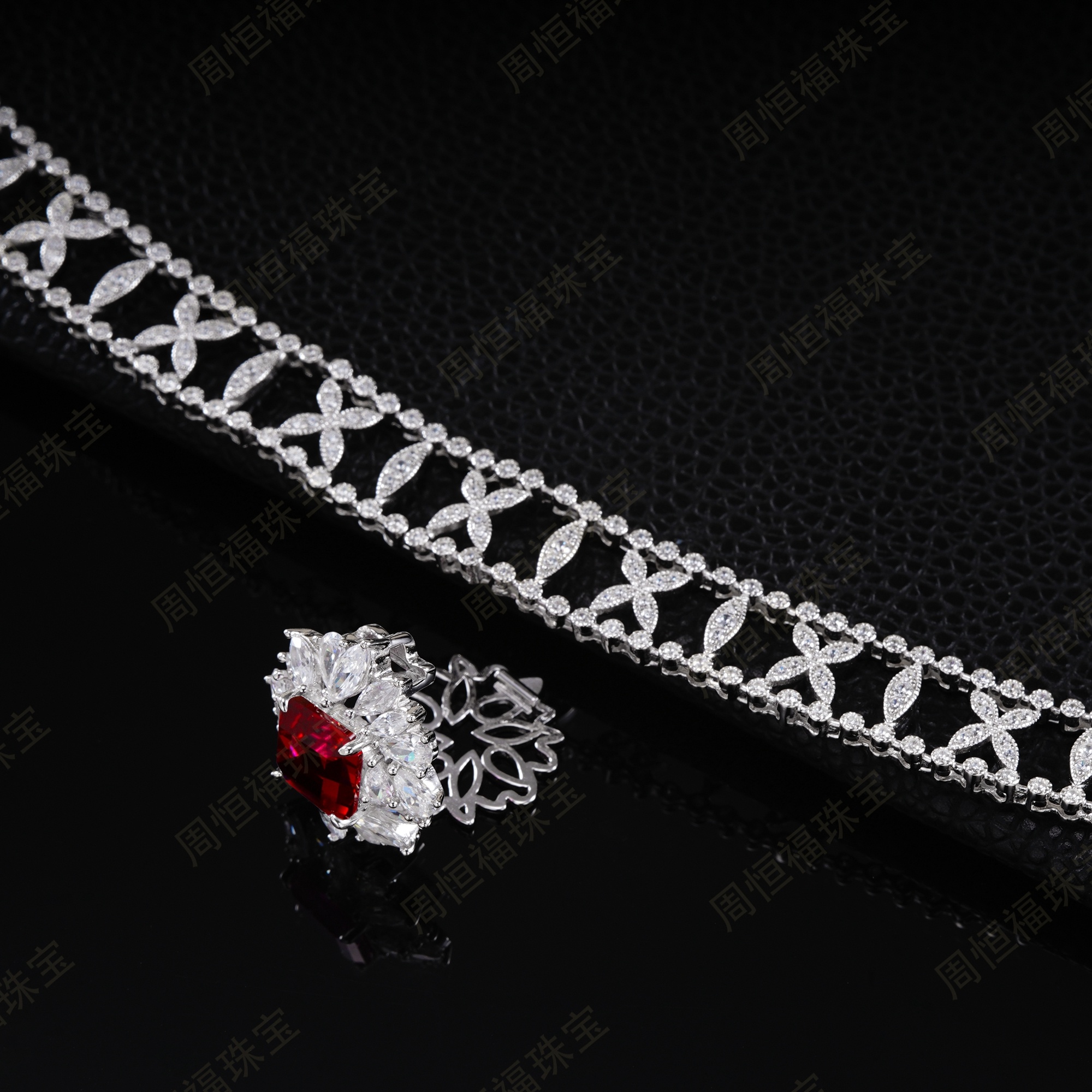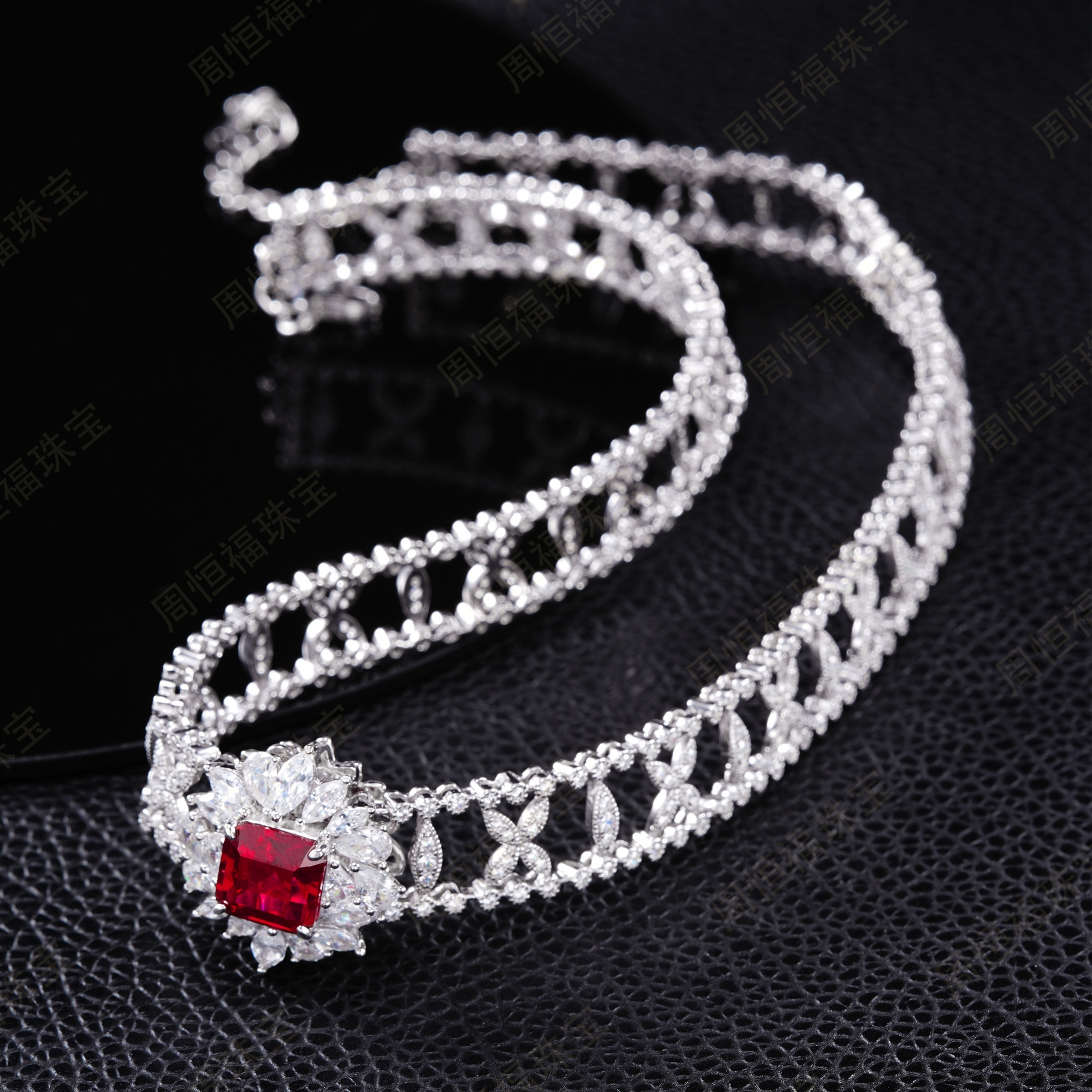这款颈链项圈设计奢华大气,方形红宝主石搭配满钻镶嵌的复杂链身,工艺精湛且极具视觉冲击力。红宝色泽浓郁纯正,与银质链身的搭配尽显高贵典雅,适合在重要宴会、高端活动等场合佩戴,能瞬间提升整体造型的奢华感与气场,是展现高贵品味与对奢华珠宝极致追求的高端配饰。