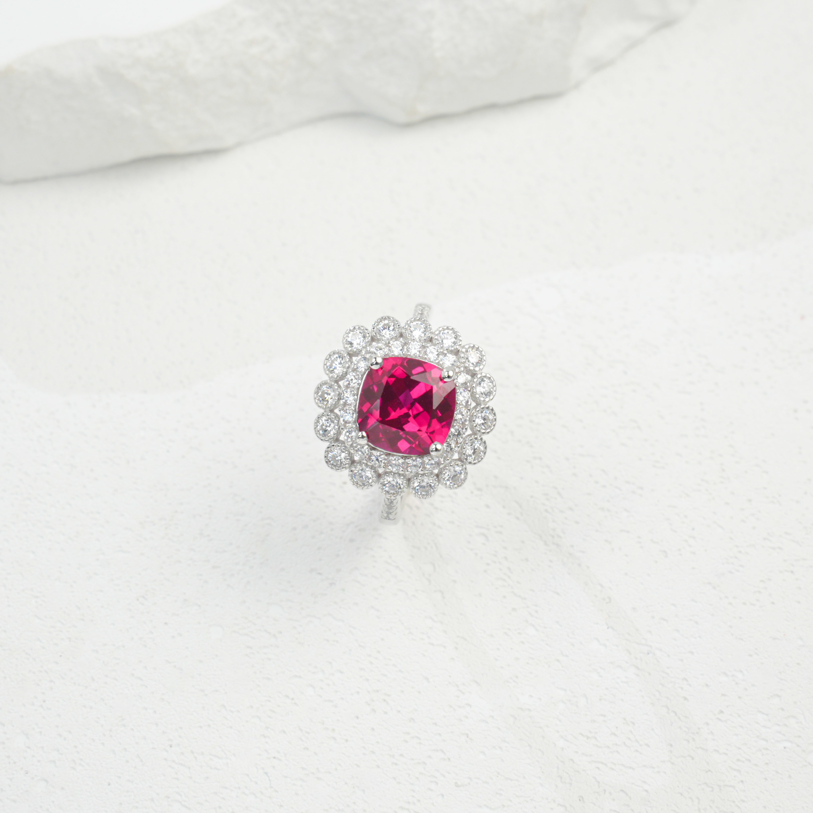 主石:枕形培育红宝石,色泽浓郁饱和,火彩灵动