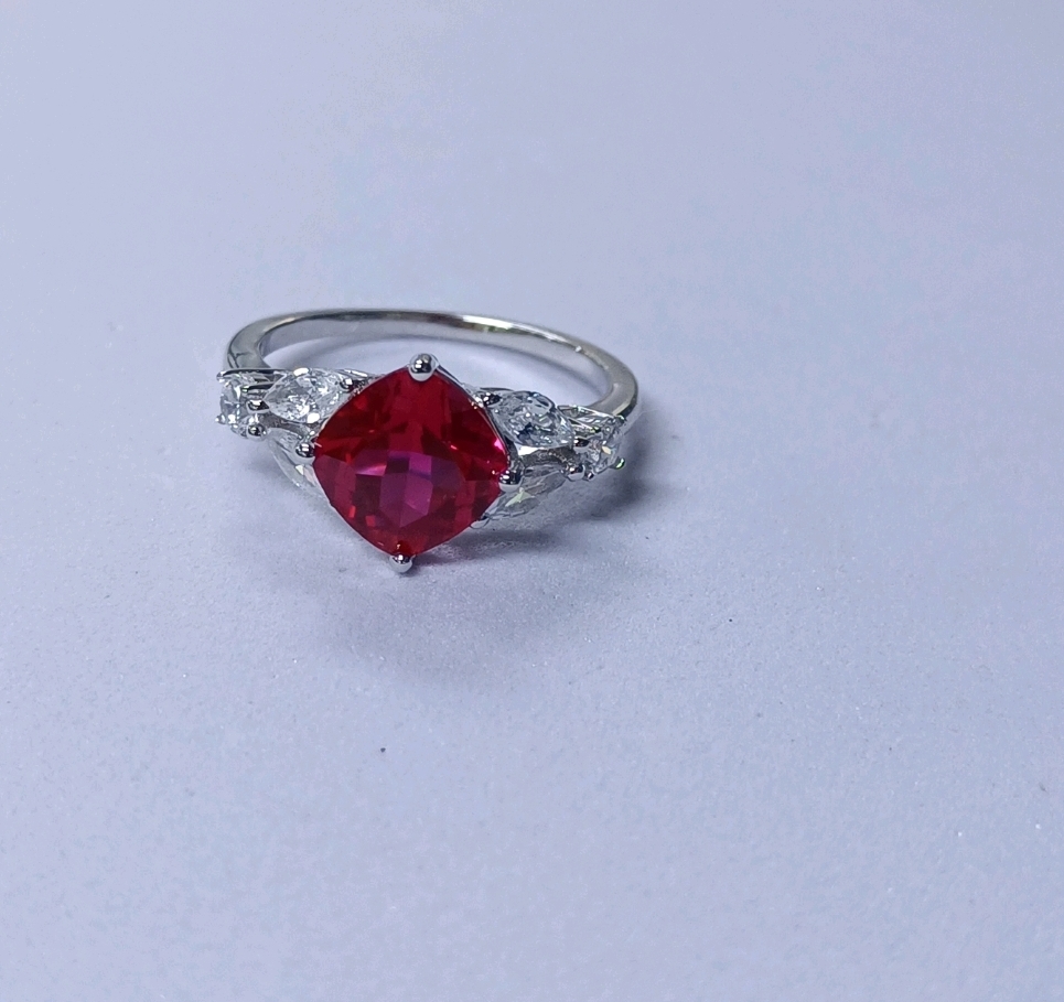 培育红宝,色泽惊艳:培育红宝石拥有与天然红宝石一致的瑰丽色泽,枕形切割让宝石火彩灵动,为你呈现高品质视觉享受。