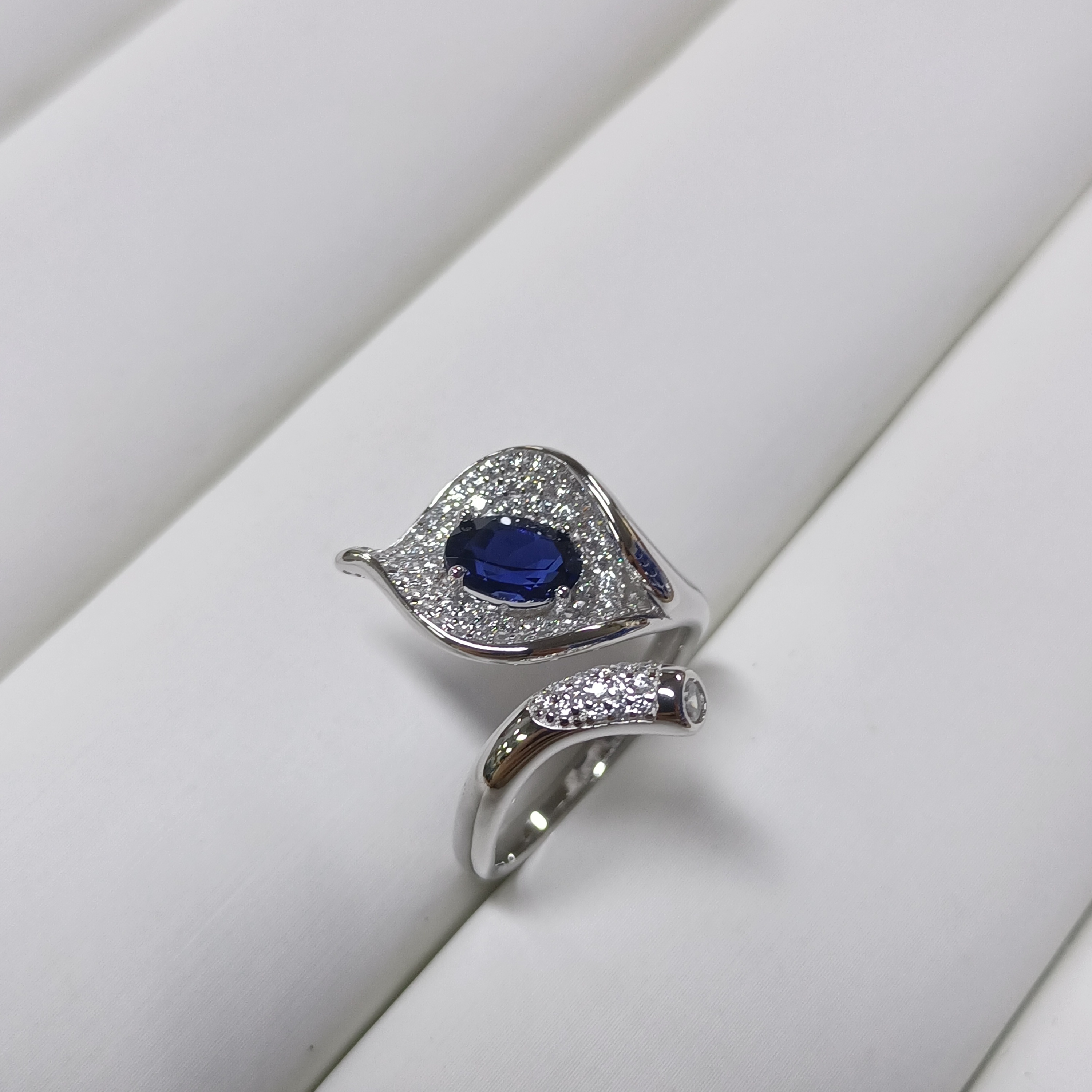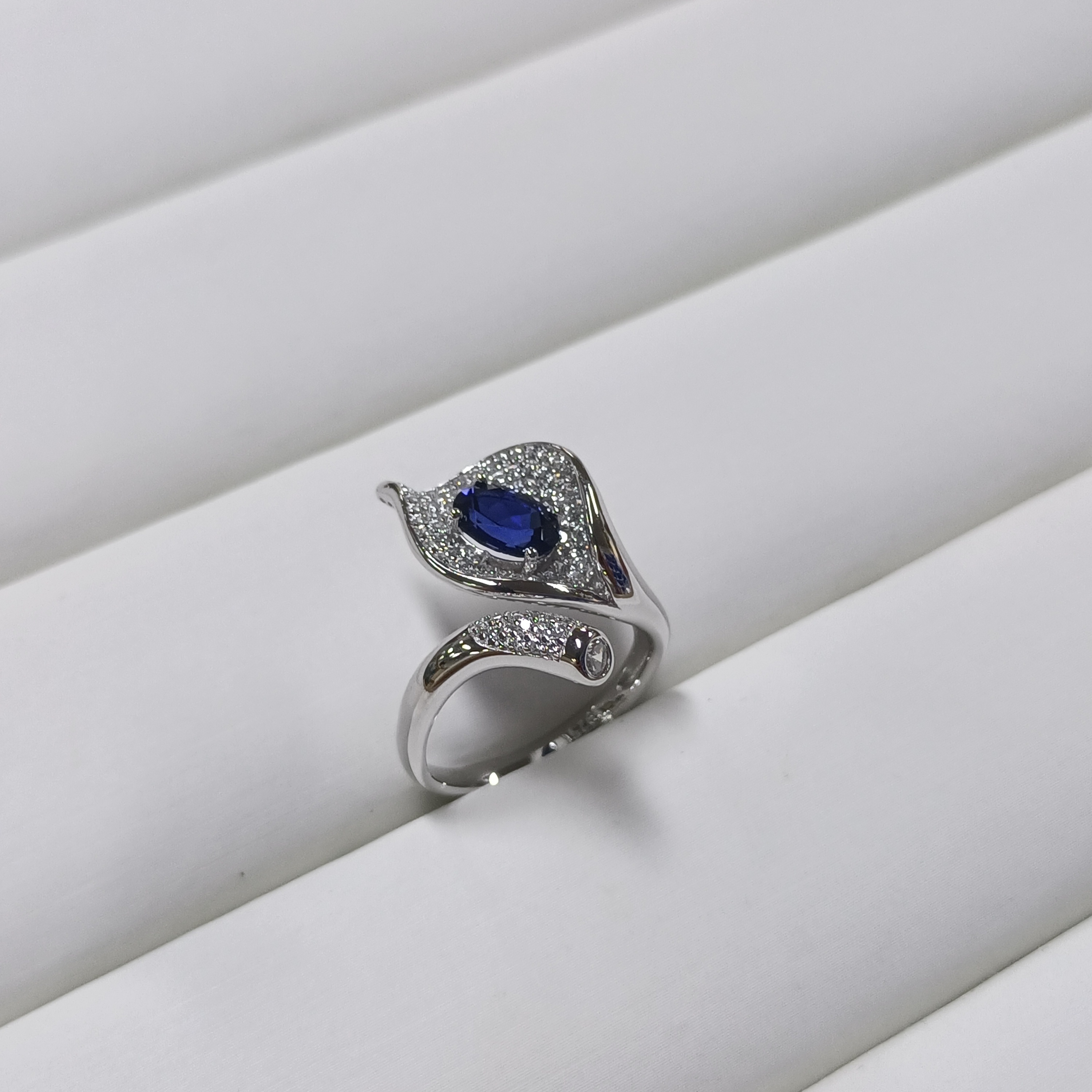 - 设计巧思:以孔雀羽造型为灵感,满镶璀璨锆石模拟羽片光泽,灵动曲线与蓝宝的深邃碰撞,小众设计极具辨识度,让戒指成为指尖吸睛焦点。