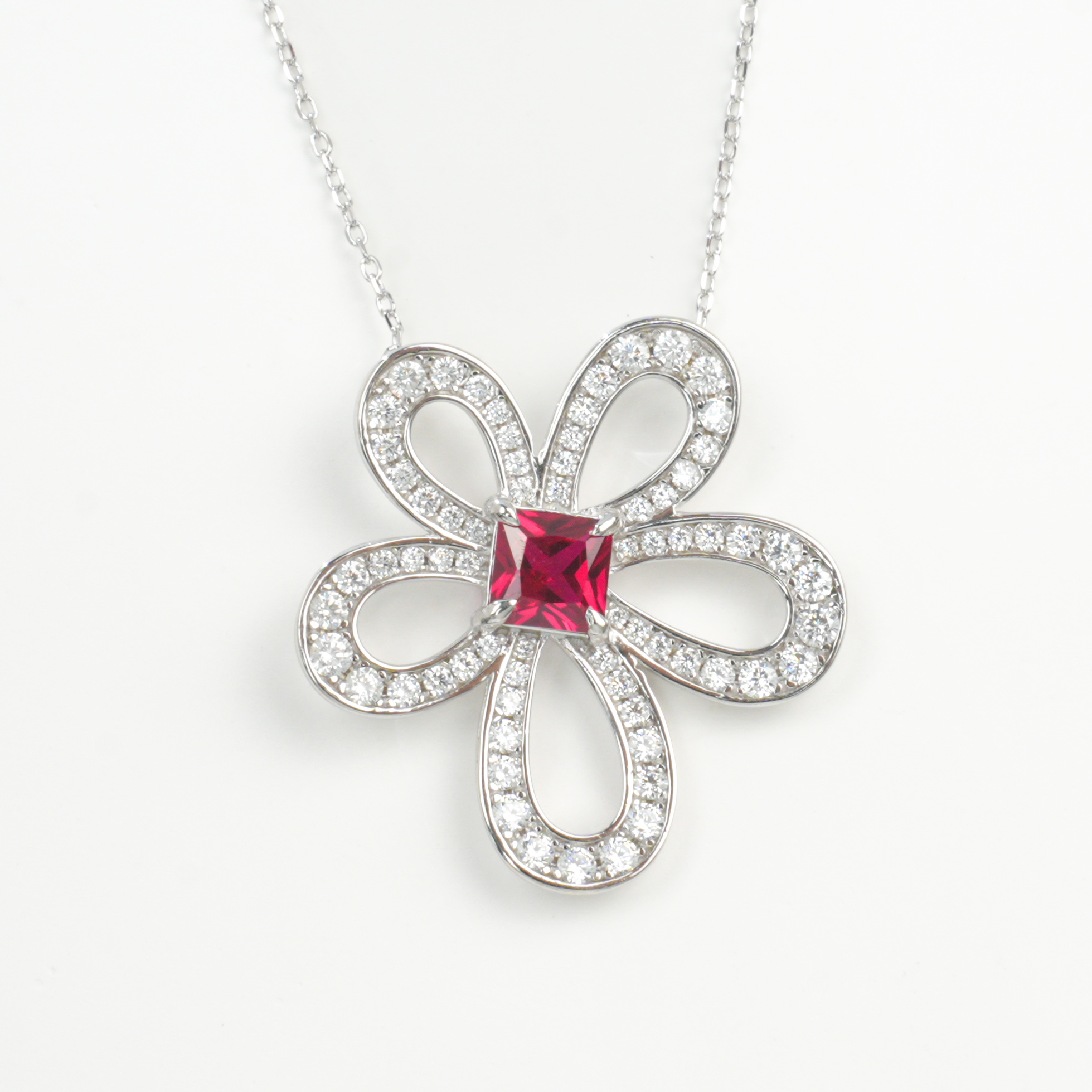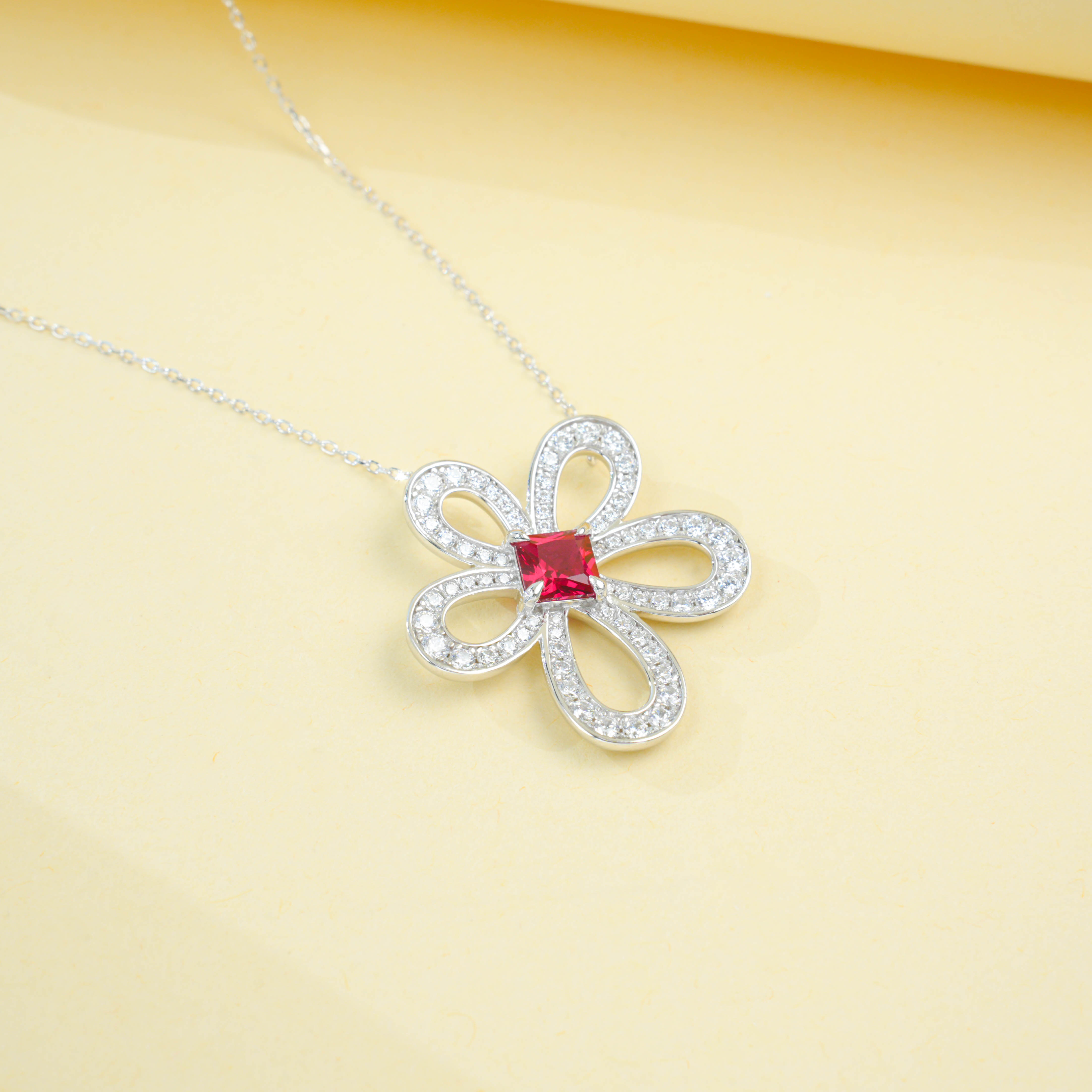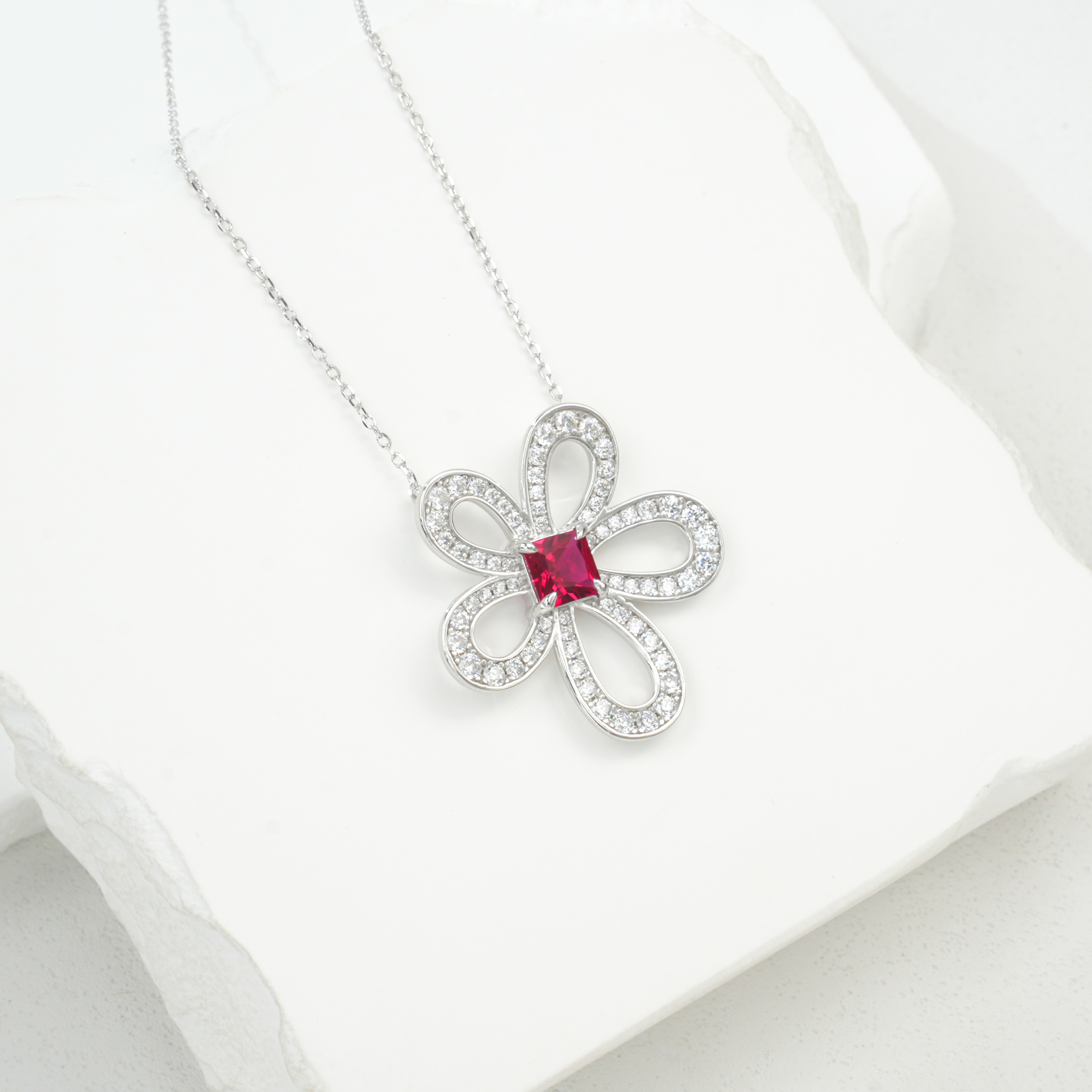 花朵造型设计,中心红宝搭配满钻镶嵌,精致优雅,适合多种场合佩戴。