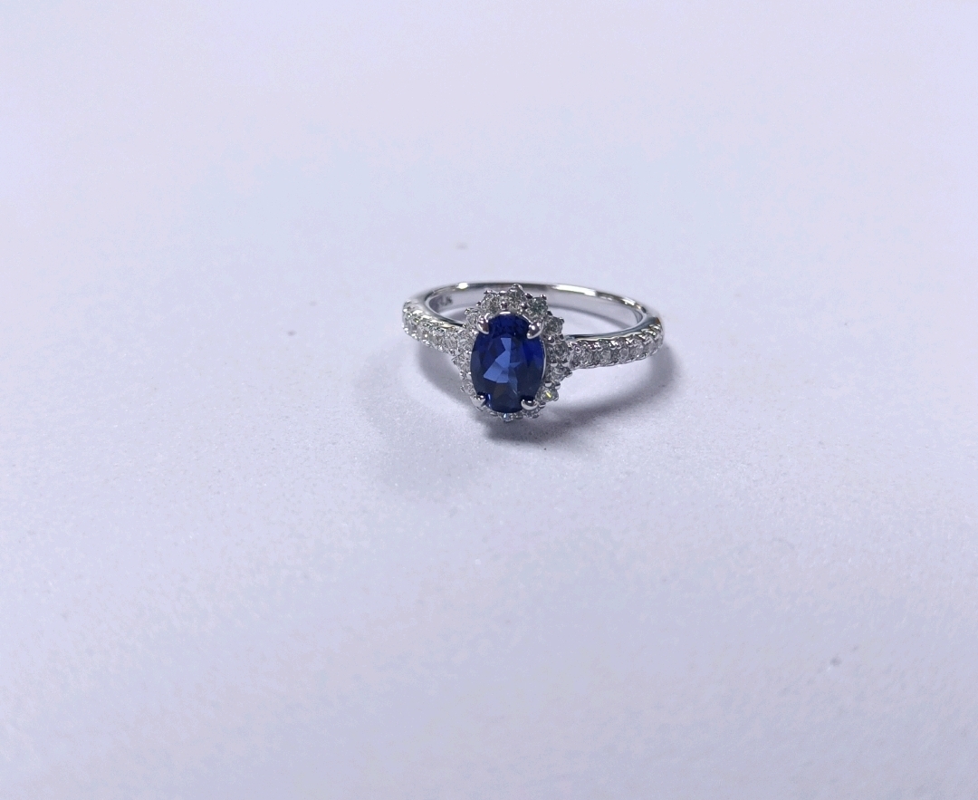 - 椭圆蓝宝切割工整,与围镶钻饰、戒臂碎钻交相辉映,镶嵌工艺精湛,每一处切面都折射璀璨光芒,让戒指在光线下时刻绽放迷人魅力。