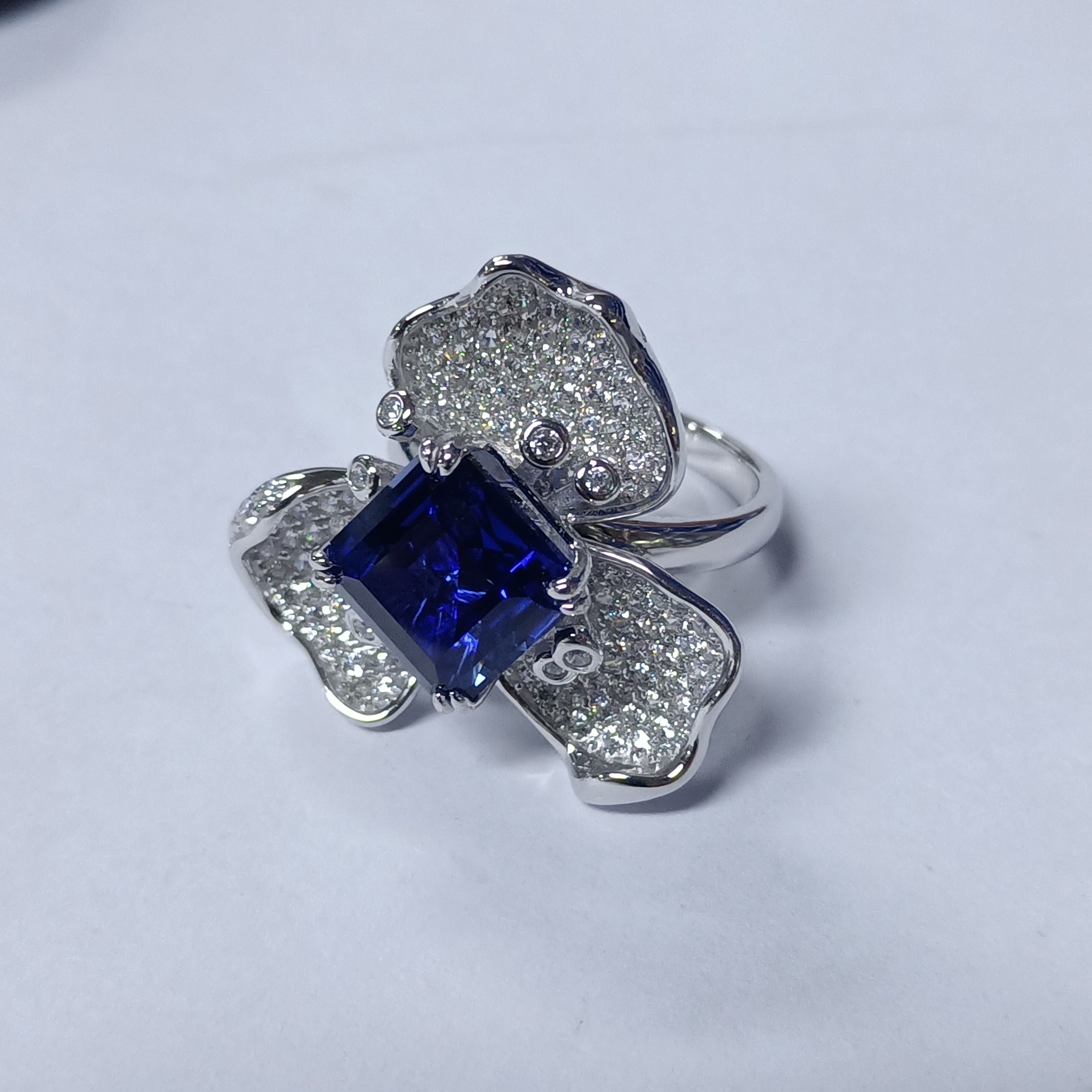 设计巧思:以蝴蝶造型为灵感,满钻镶嵌模拟蝶翼光泽,中央方形蓝宝如蝶身宝石,将自然艺术与轻奢珠宝融合,小众设计极具艺术辨识度,是指尖的吸睛艺术品。