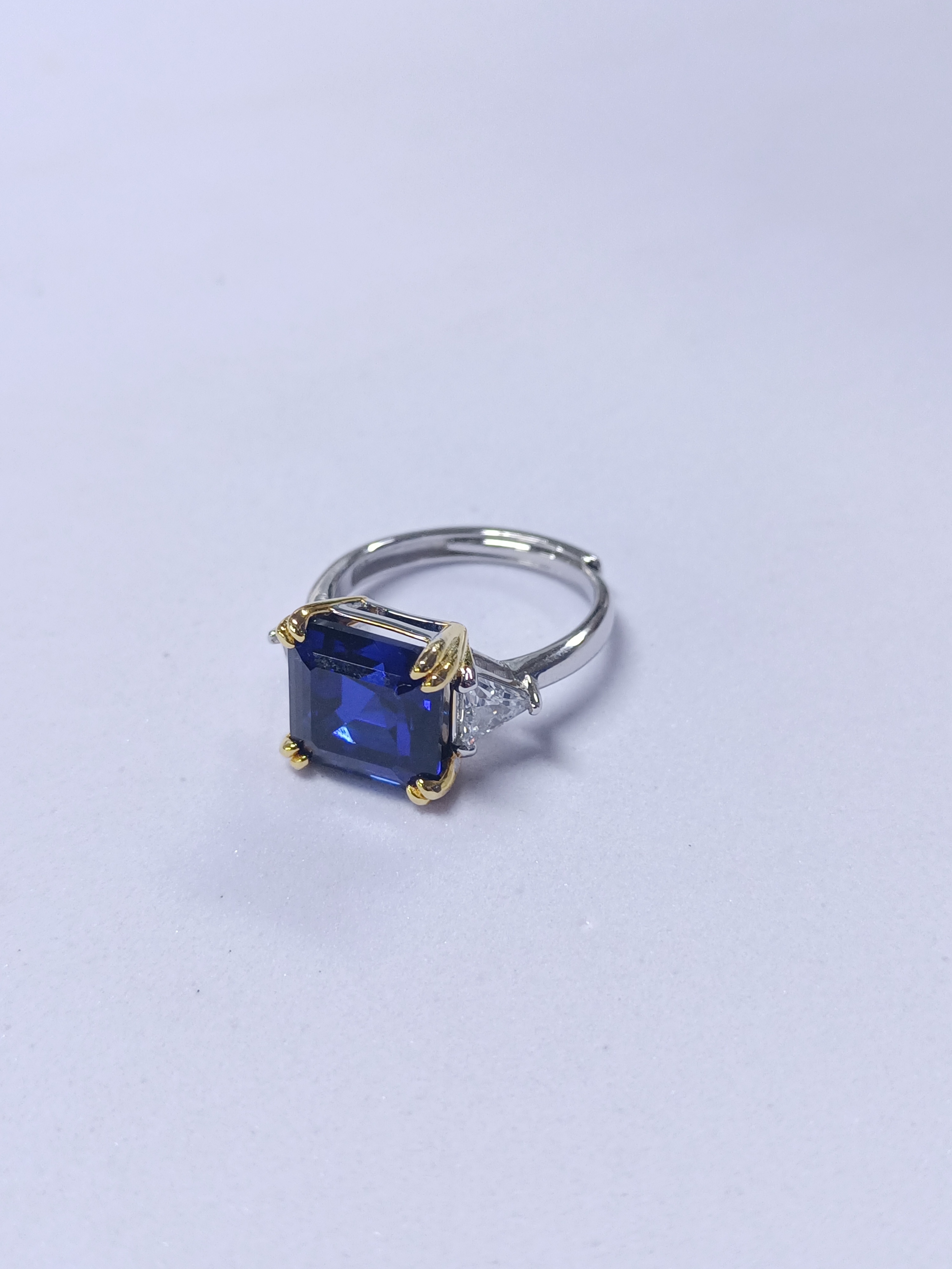 公主方蓝宝切割工整,金银双色爪镶工艺精湛,最大程度展现宝石火彩与色泽;侧钻与银戒身的搭配,让戒指在光线下时刻绽放 “撞色奢华” 的魅力。