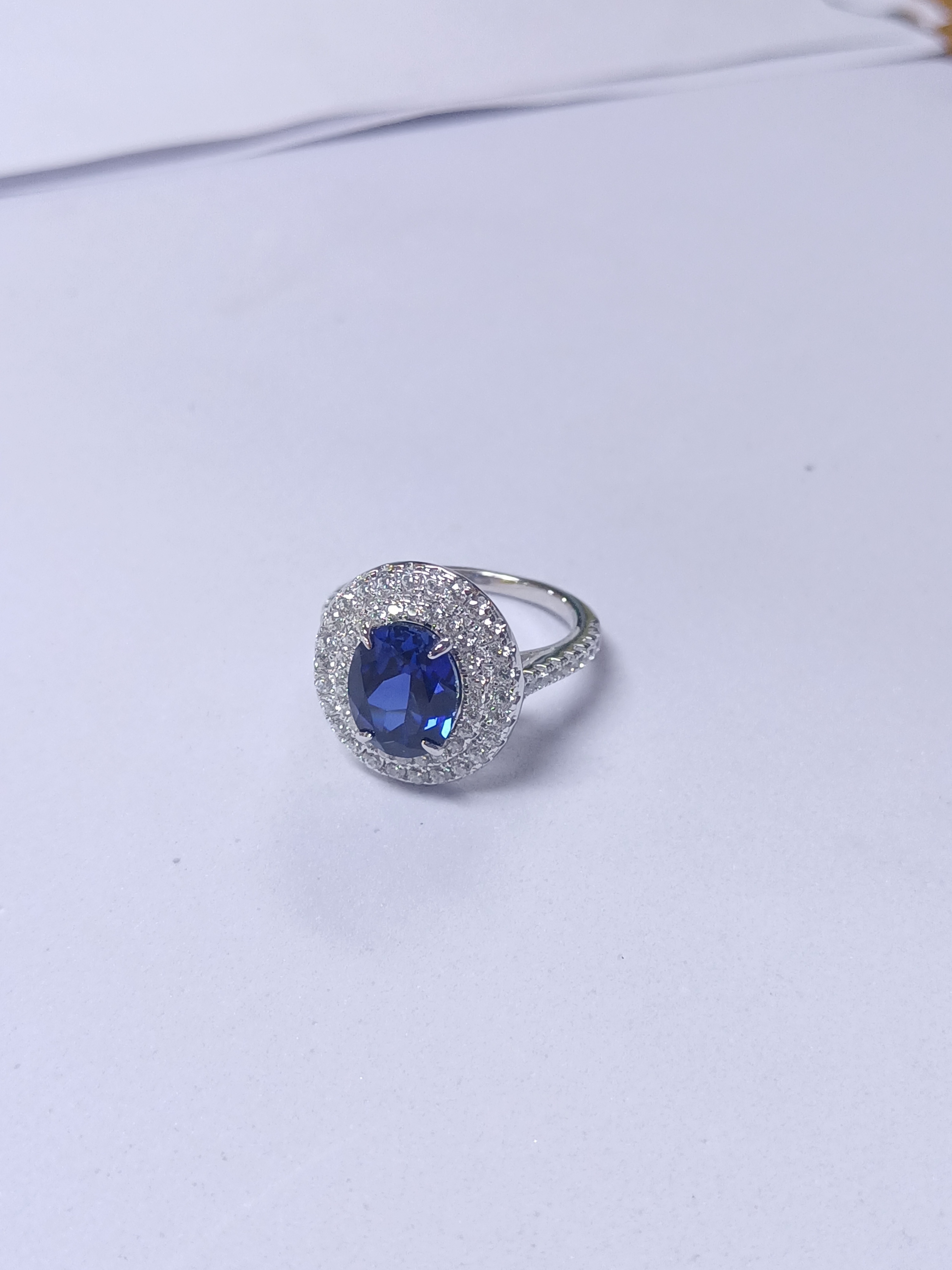 宝石魅力:主石为 8×10MM/3.53CT 培育蓝宝石,圆形切割色泽浓郁深邃,火彩饱满绚烂,大克拉尺寸带来强烈视觉冲击,复刻天然蓝宝石的收藏级质感,每一次佩戴都如一场奢华庆典。