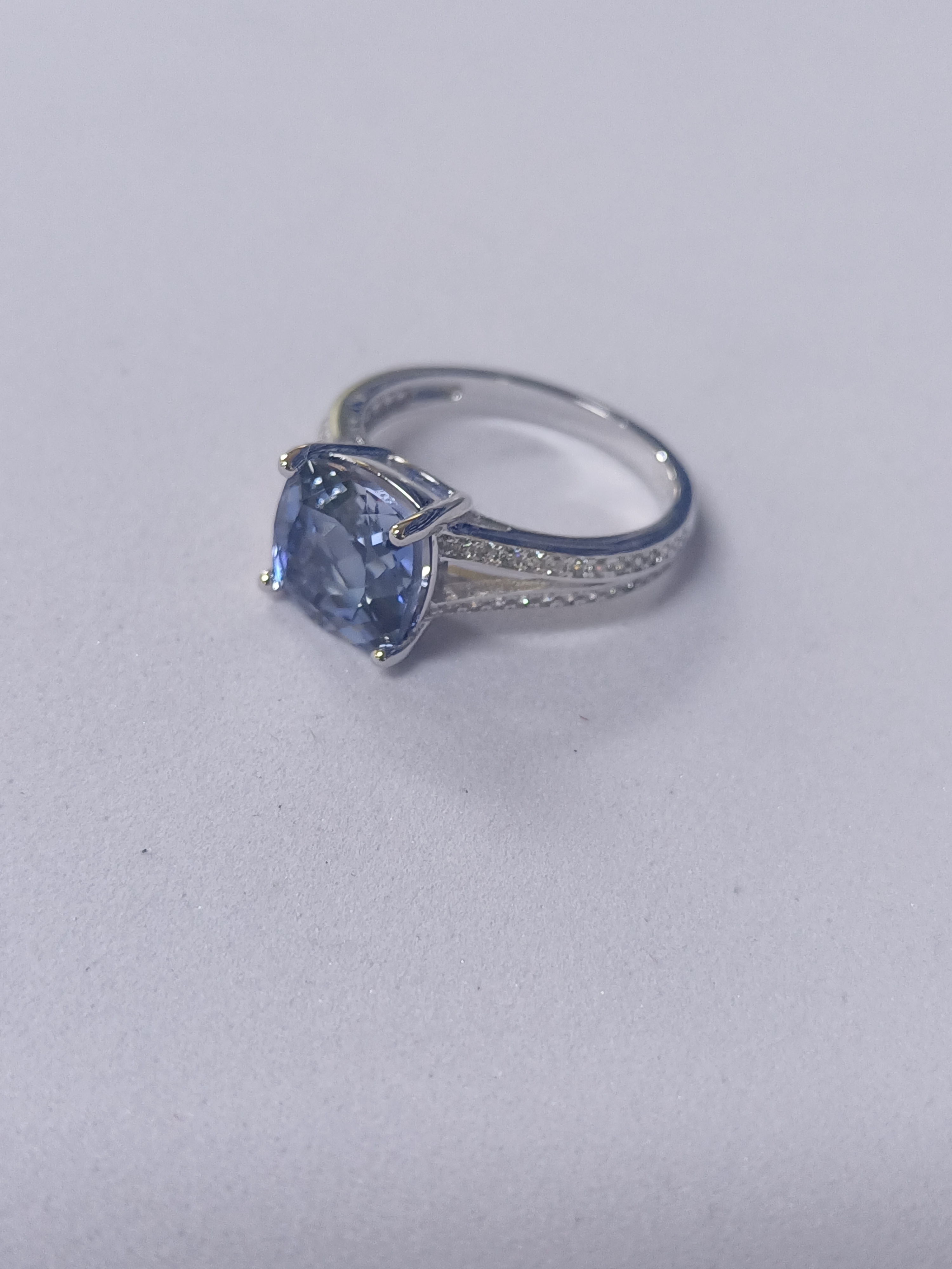 宝石魅力:主石为 9MM/4.56CT 培育蓝宝石,枕形切割色泽浓郁深邃,火彩饱满绚烂,大克拉尺寸带来强烈视觉冲击,复刻天然蓝宝石的高级质感,每一次佩戴都尽显轻奢气场。