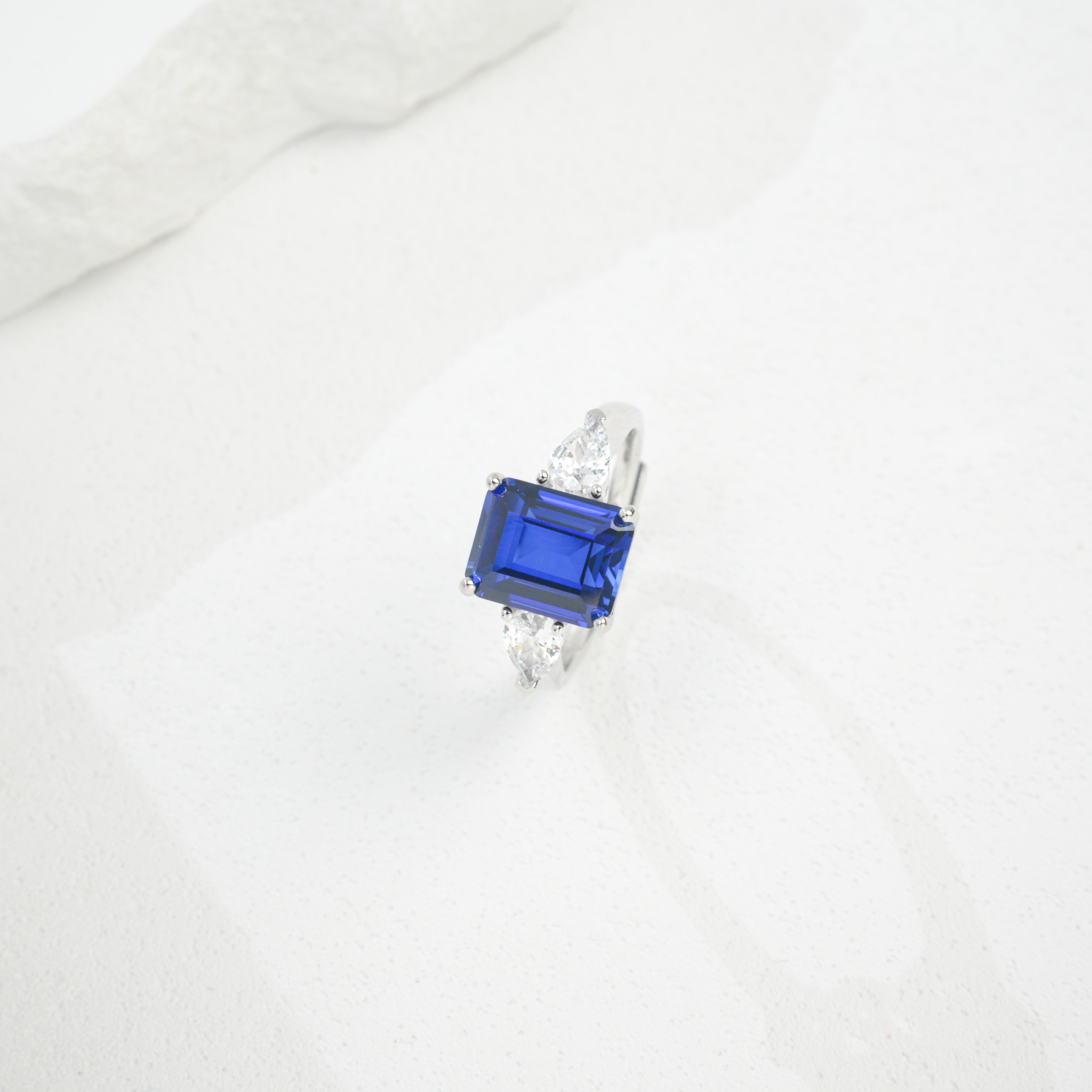 宝石魅力:主石为 8×10MM/4.37CT 培育蓝宝石,祖母绿切割色泽浓郁深邃,火彩饱满绚烂,大克拉尺寸带来强烈视觉冲击,复刻天然蓝宝石的高级质感,每一次佩戴都尽显极简高定气场。