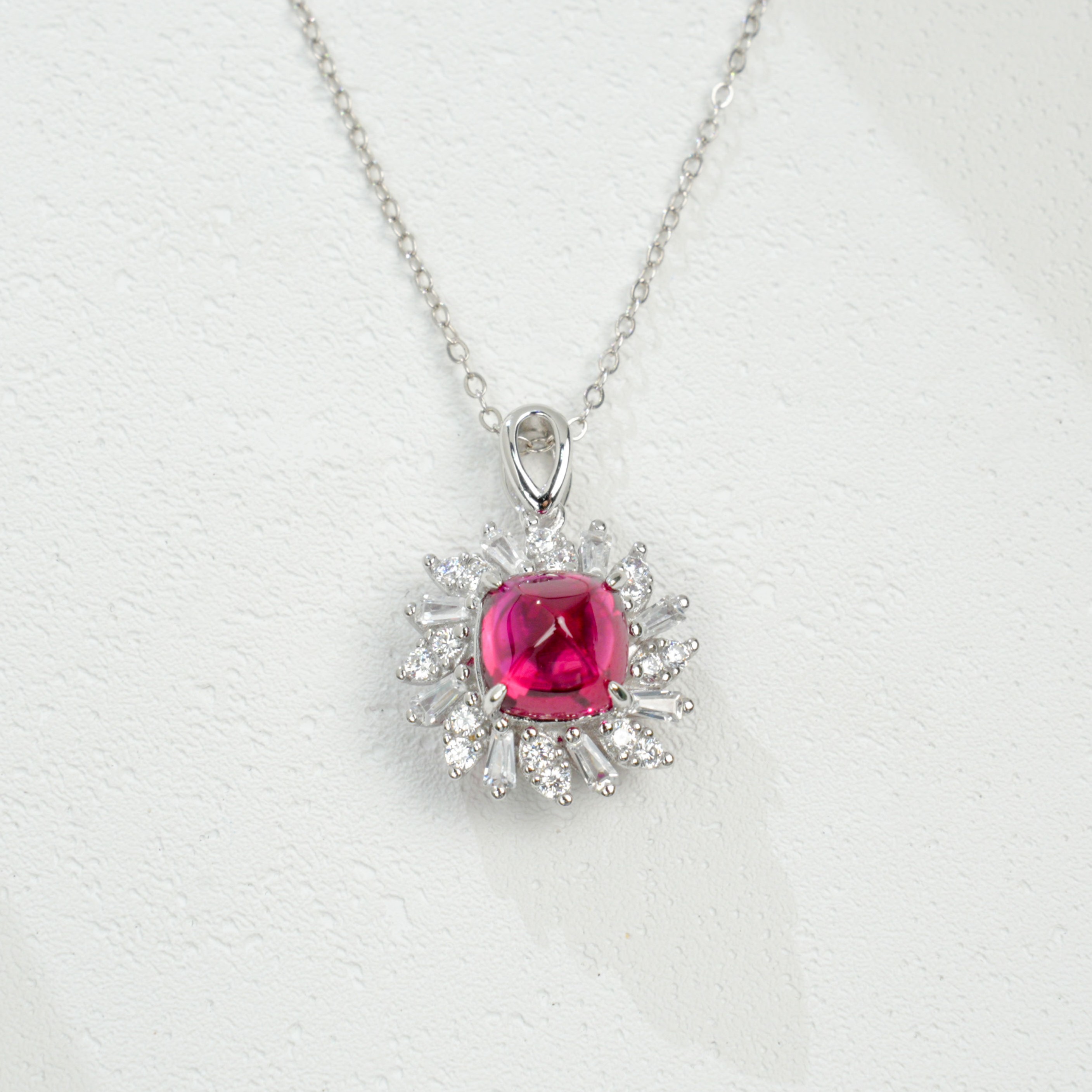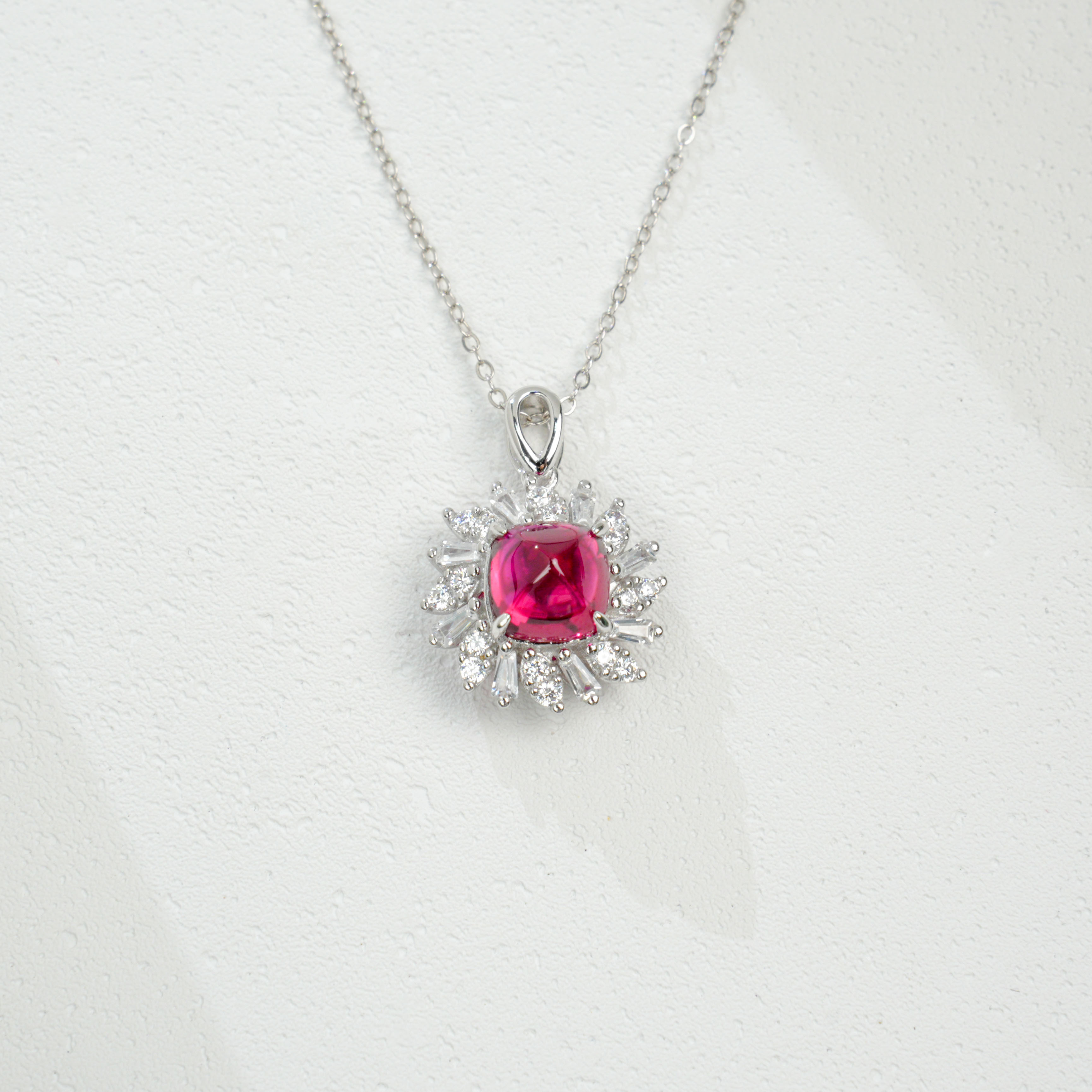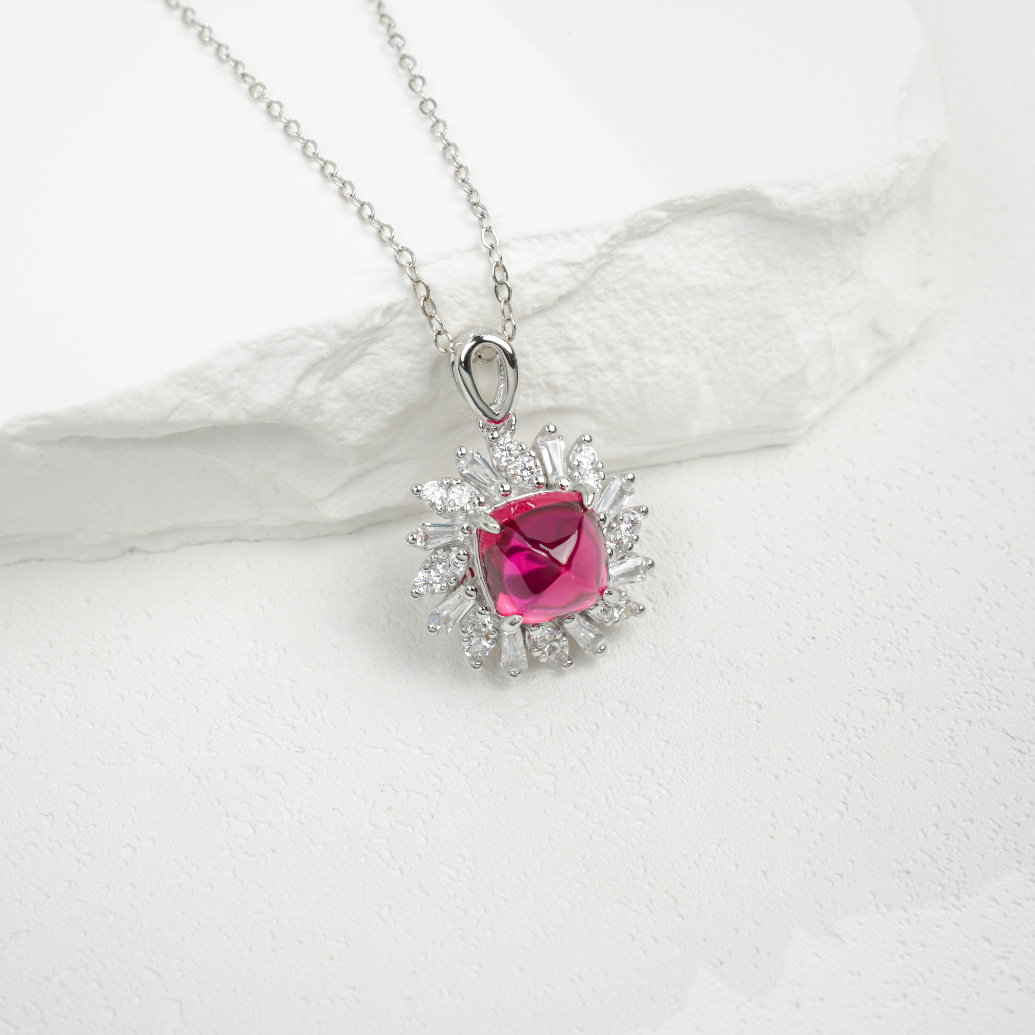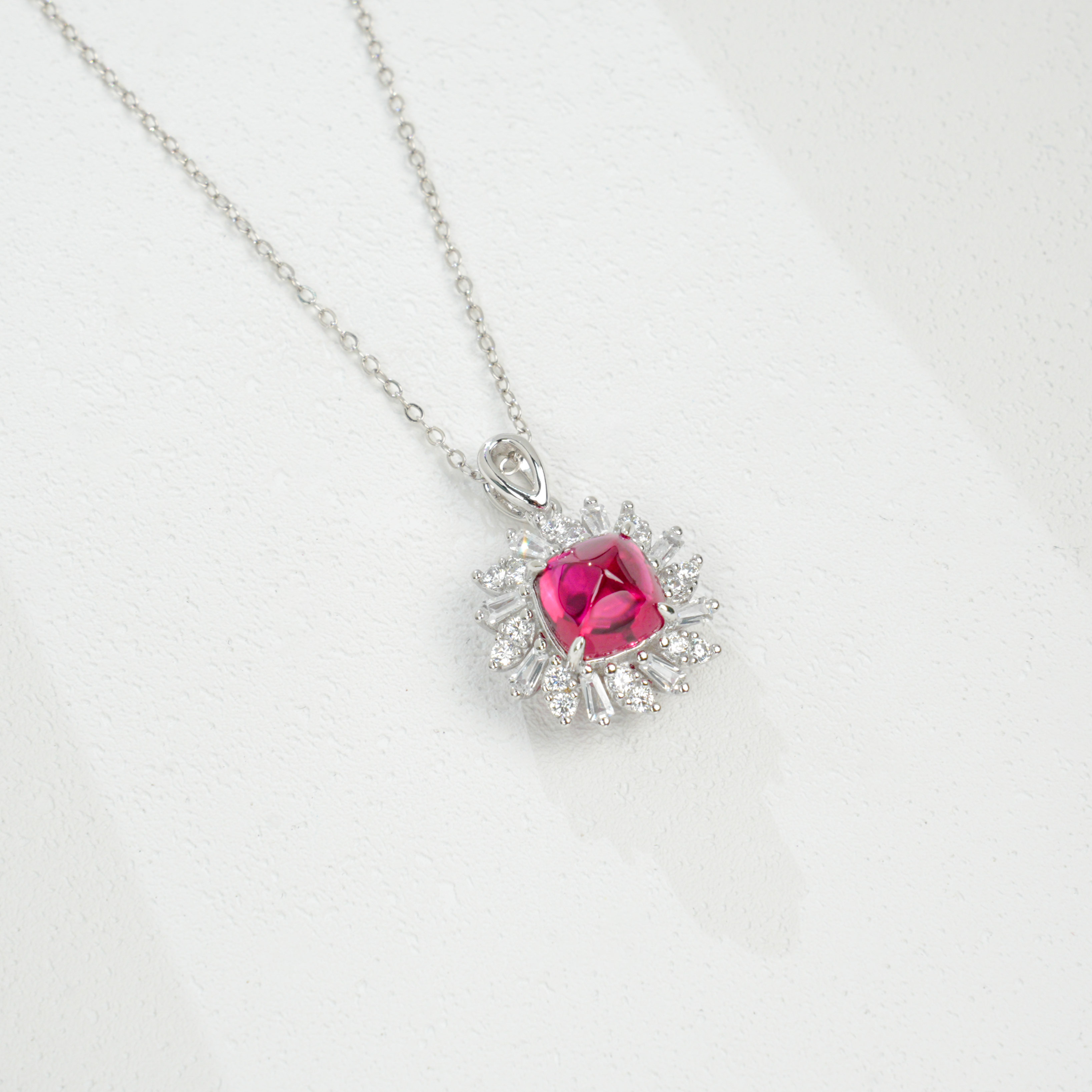 925 银培育红宝方钻星芒项链