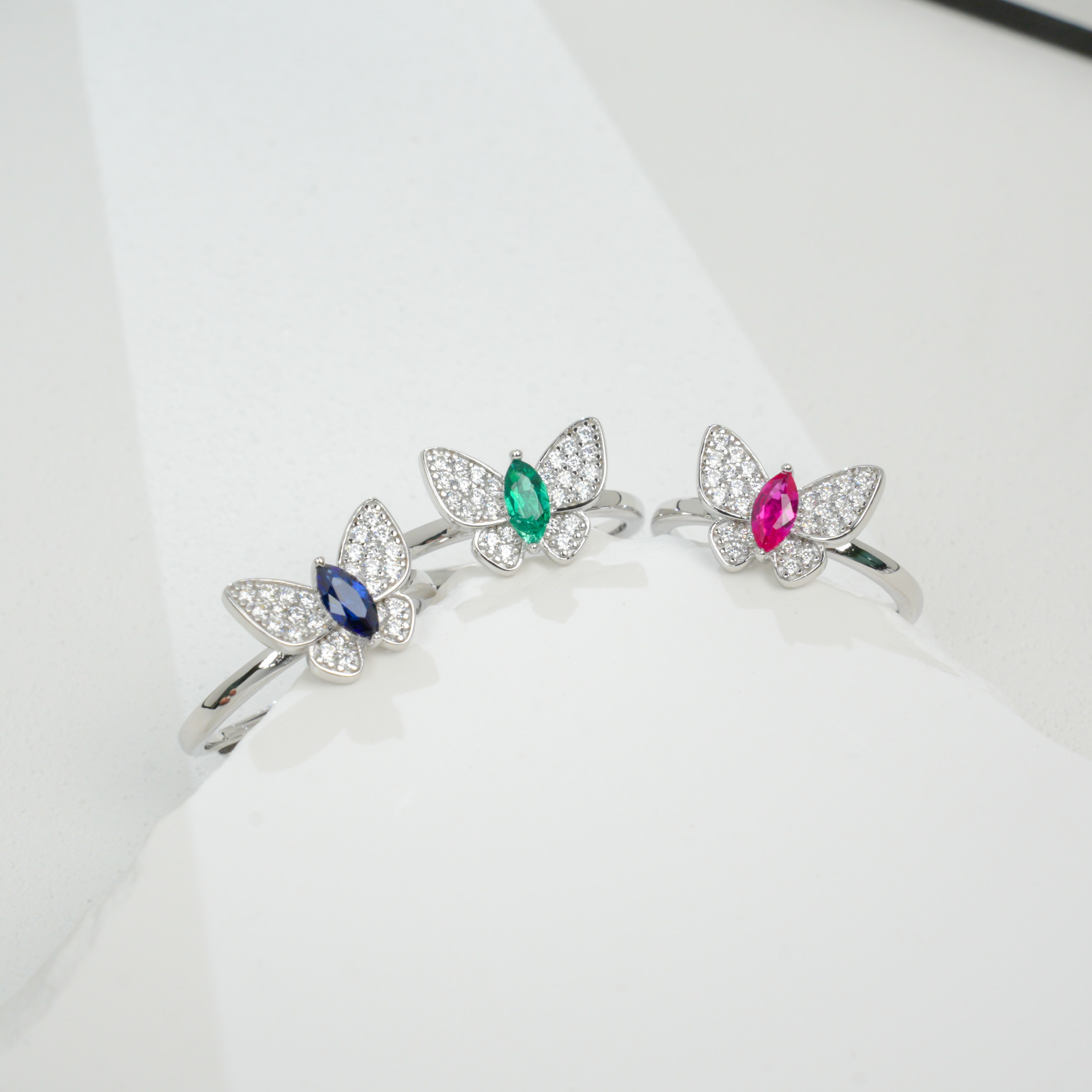 宝石魅力:主石为 3×6MM 培育蓝宝石,马眼切割色泽浓郁深邃,火彩饱满,与满钻蝴蝶翅膀形成梦幻组合,复刻天然宝石的高级质感,每一次佩戴都尽显浪漫灵动气场。