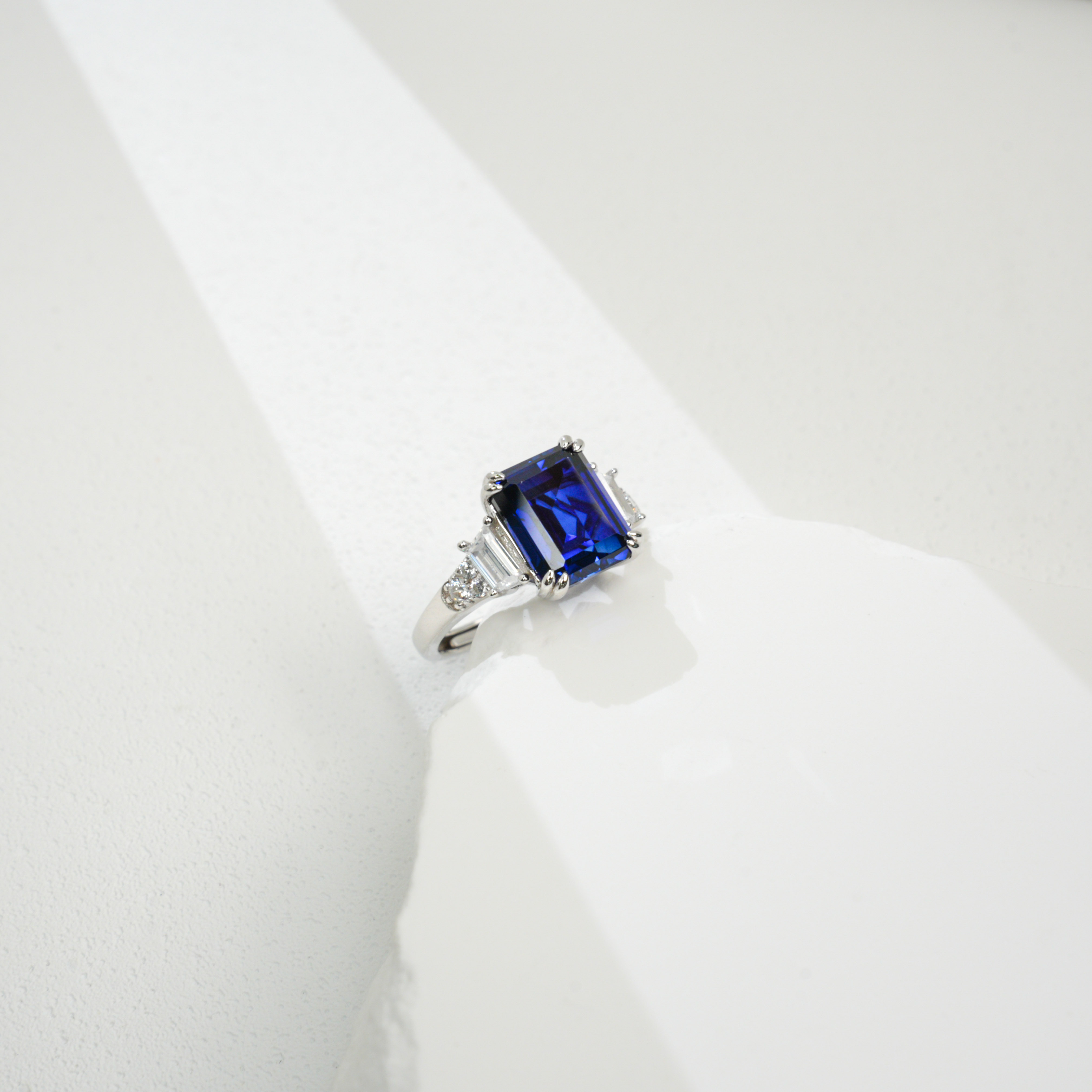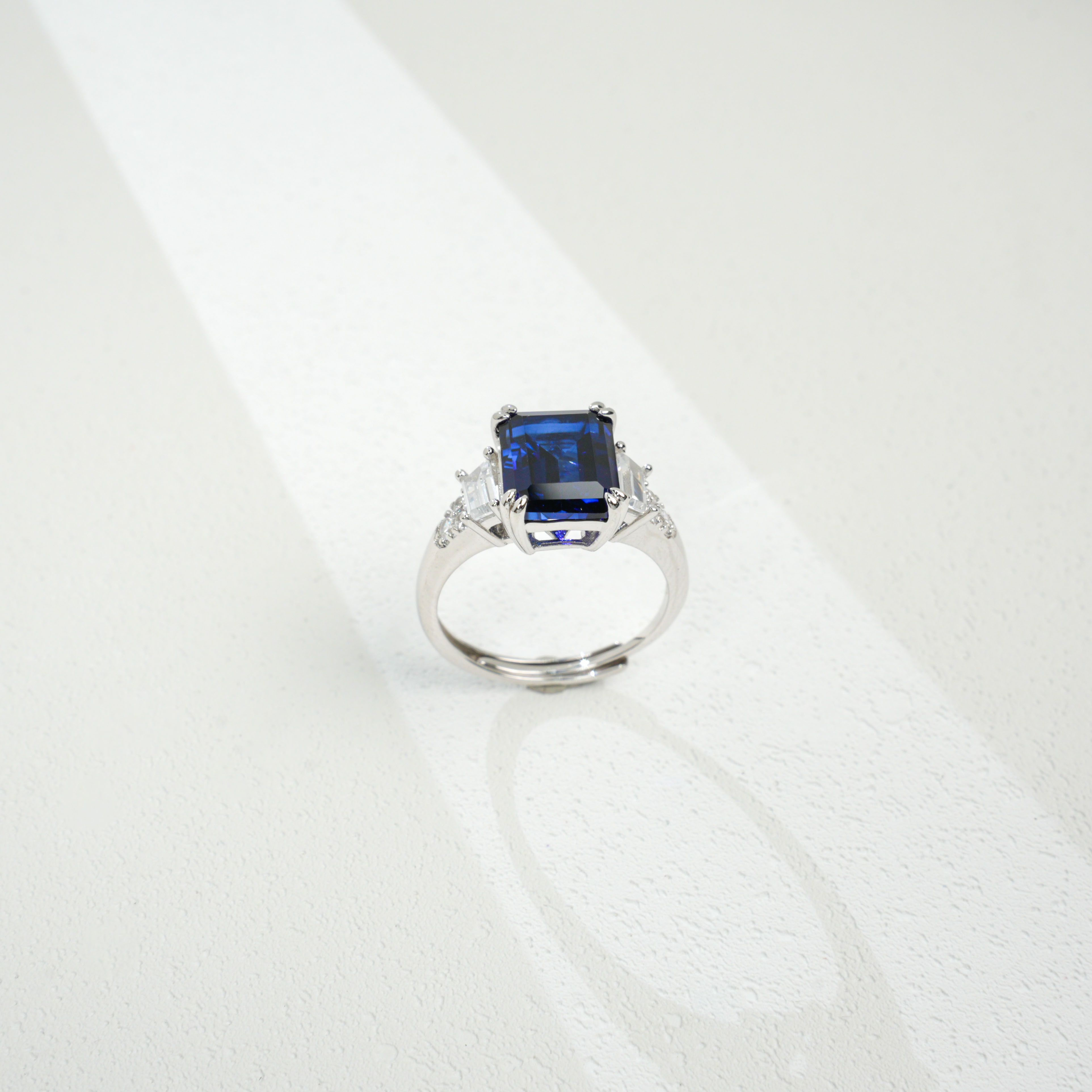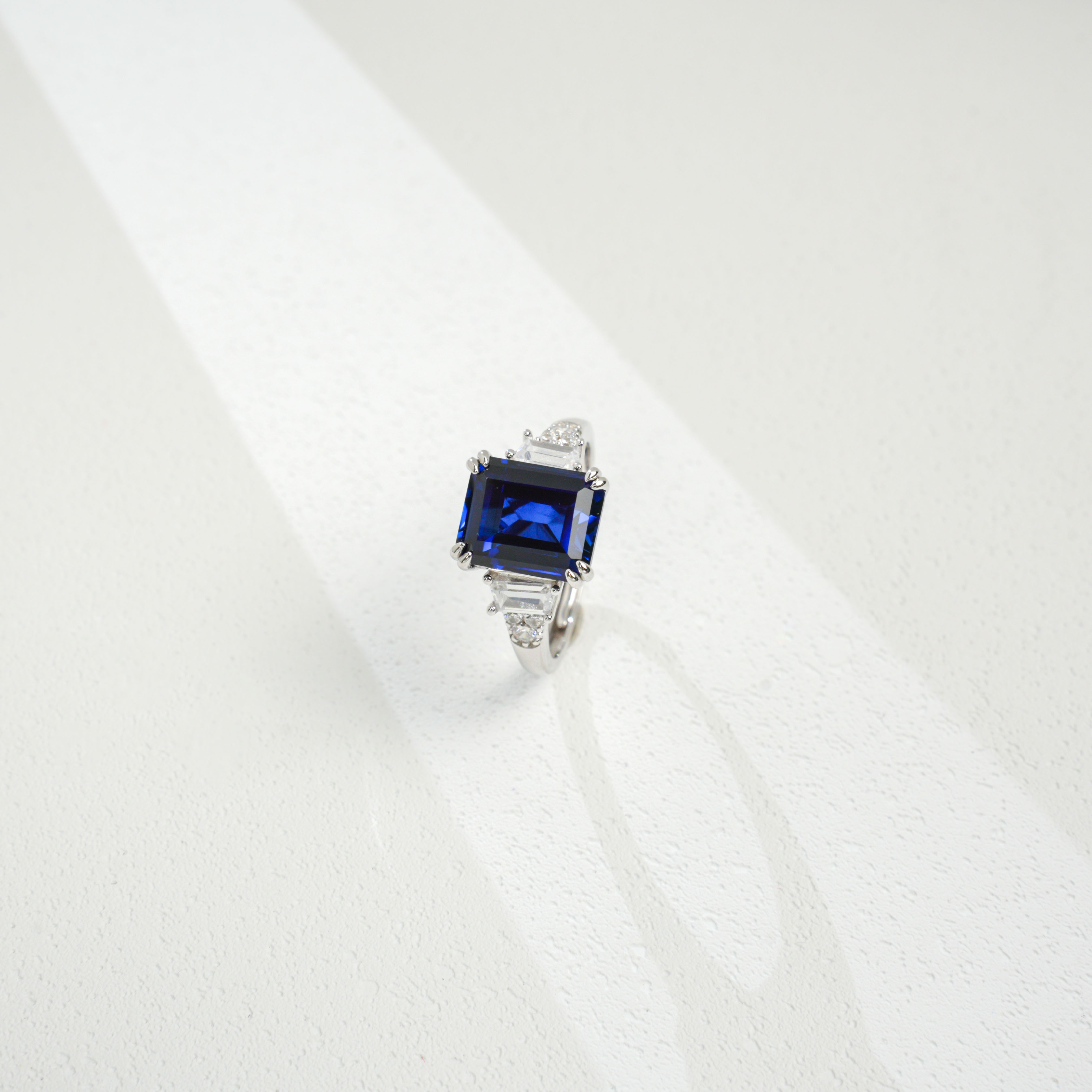 宝石魅力:主石为 8×10MM/4CT 培育蓝宝石,祖母绿切割色泽浓郁深邃,火彩饱满绚烂,大克拉尺寸带来强烈视觉冲击,复刻天然蓝宝石的高级质感,每一次佩戴都尽显轻奢高定气场。