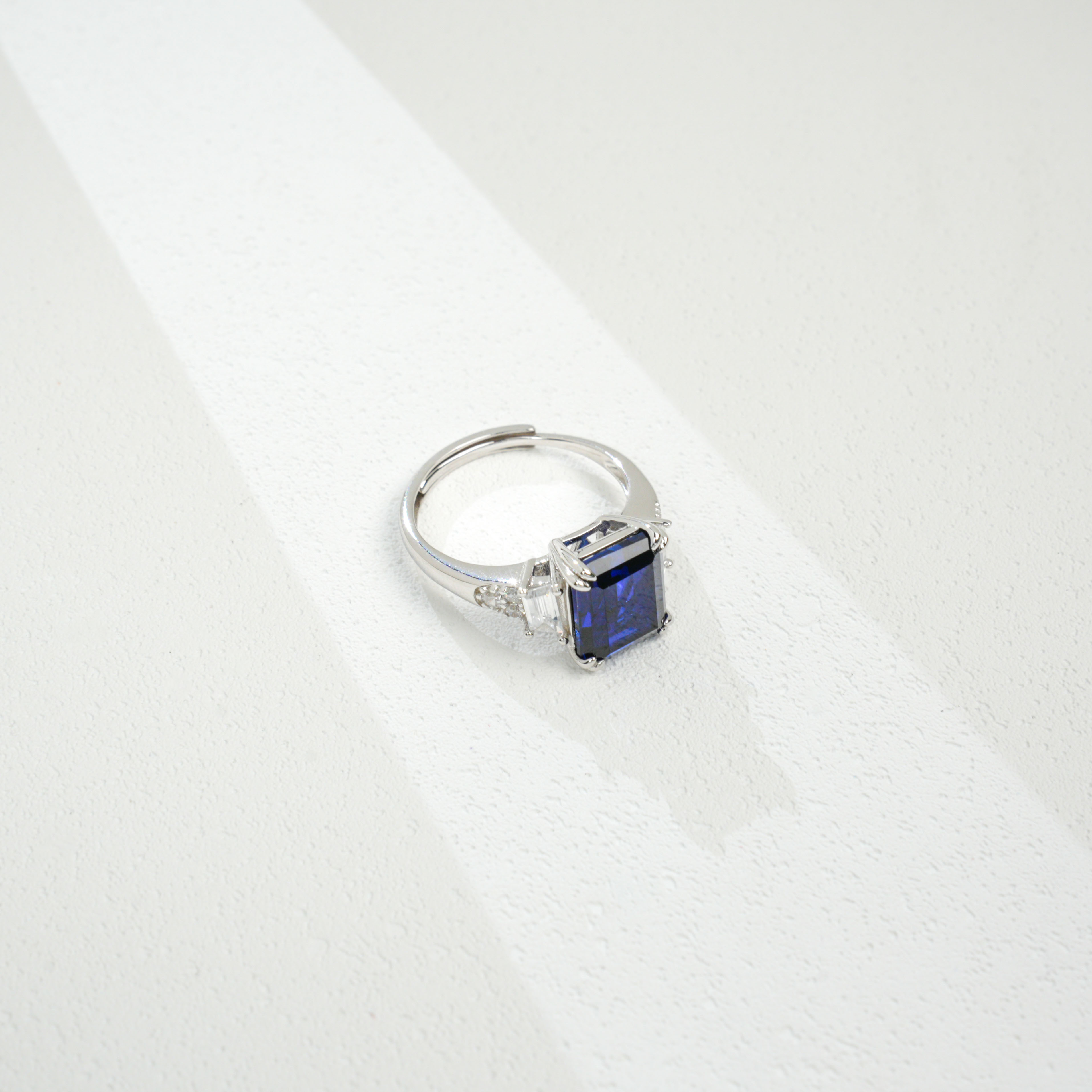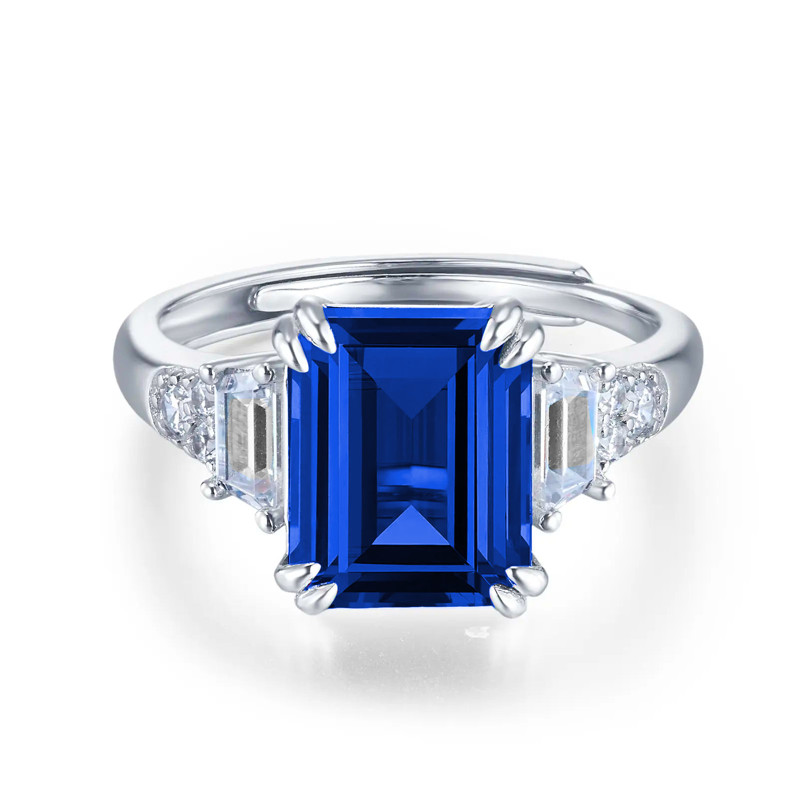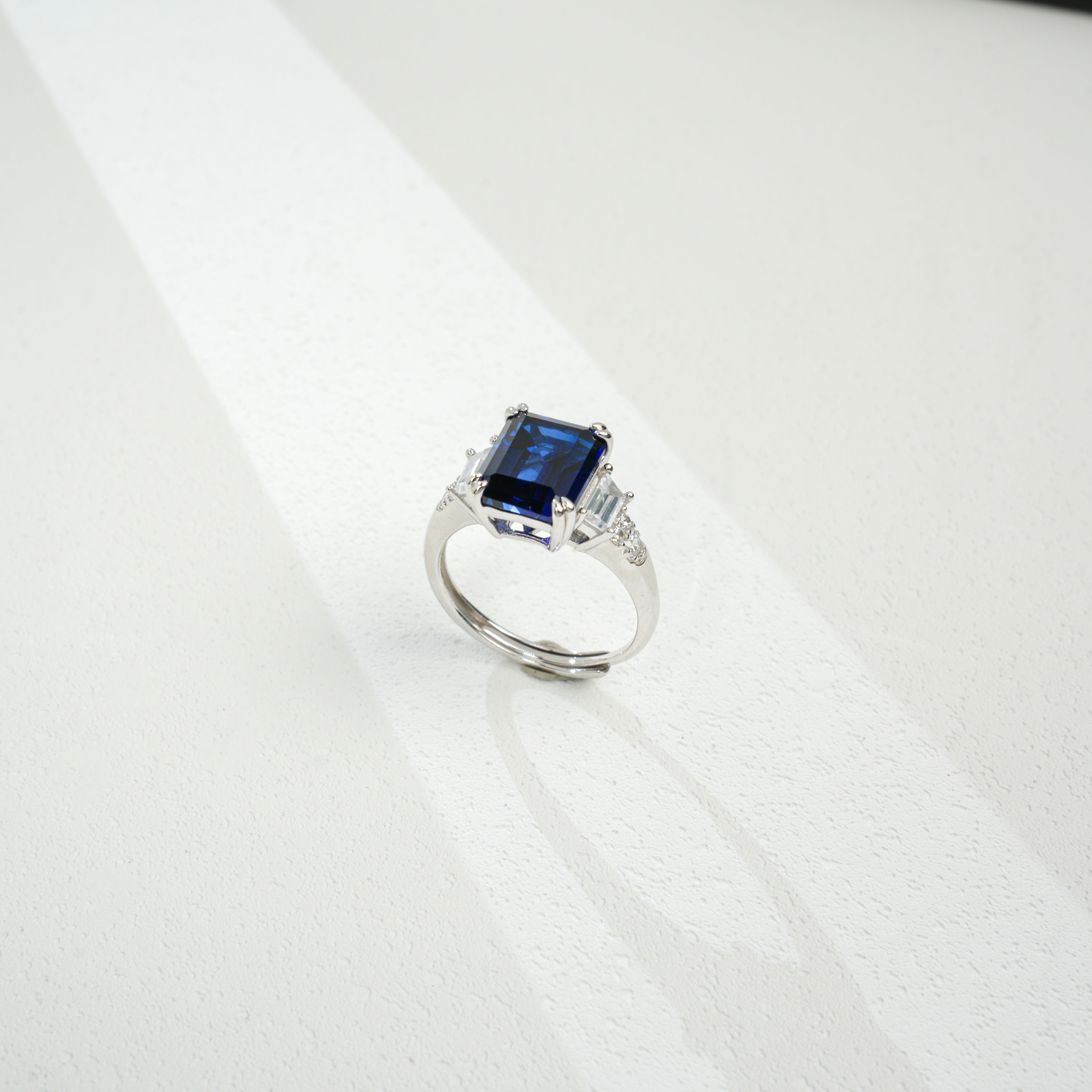 宝石魅力:主石为 8×10MM/4CT 培育蓝宝石,祖母绿切割色泽浓郁深邃,火彩饱满绚烂,大克拉尺寸带来强烈视觉冲击,复刻天然蓝宝石的高级质感,每一次佩戴都尽显轻奢高定气场。