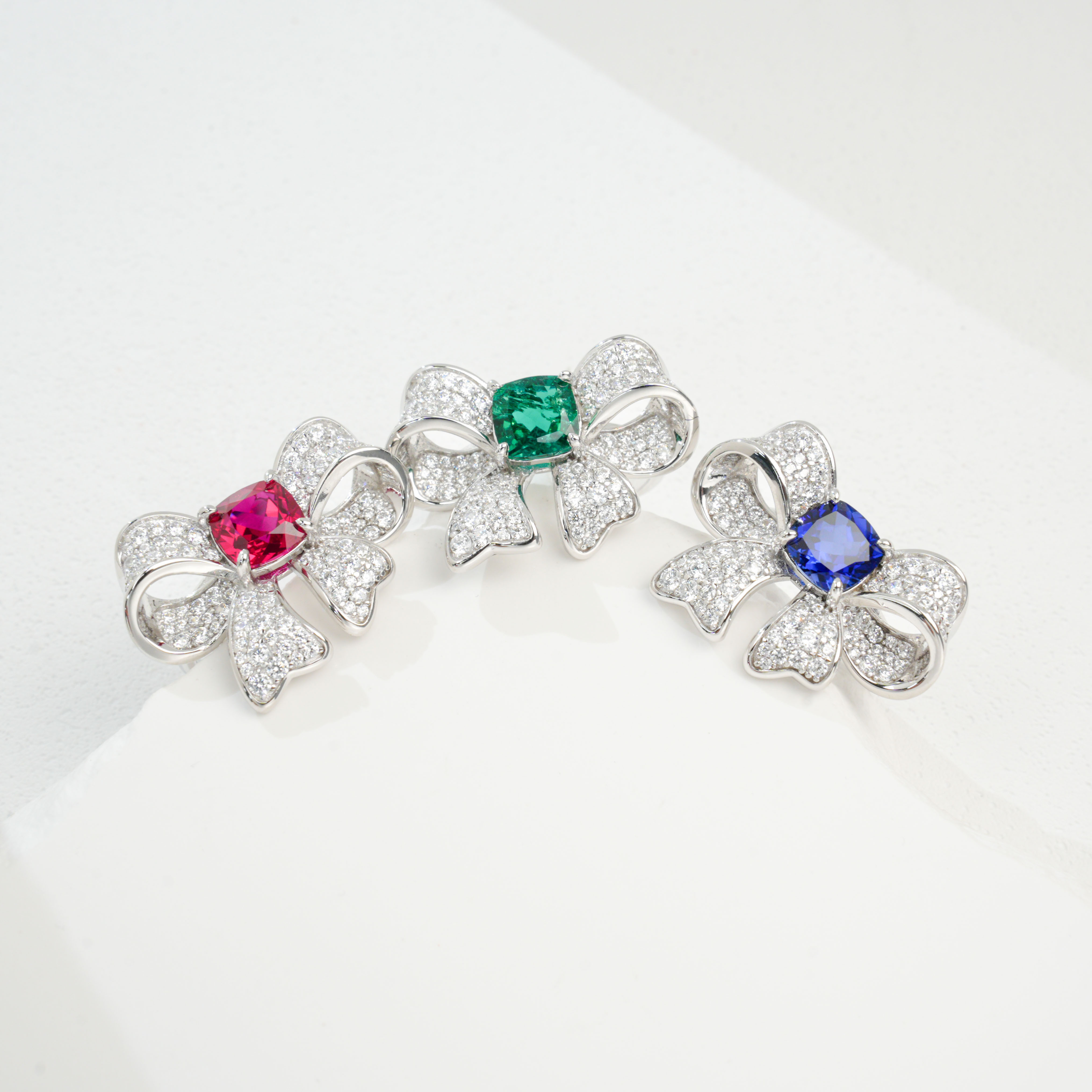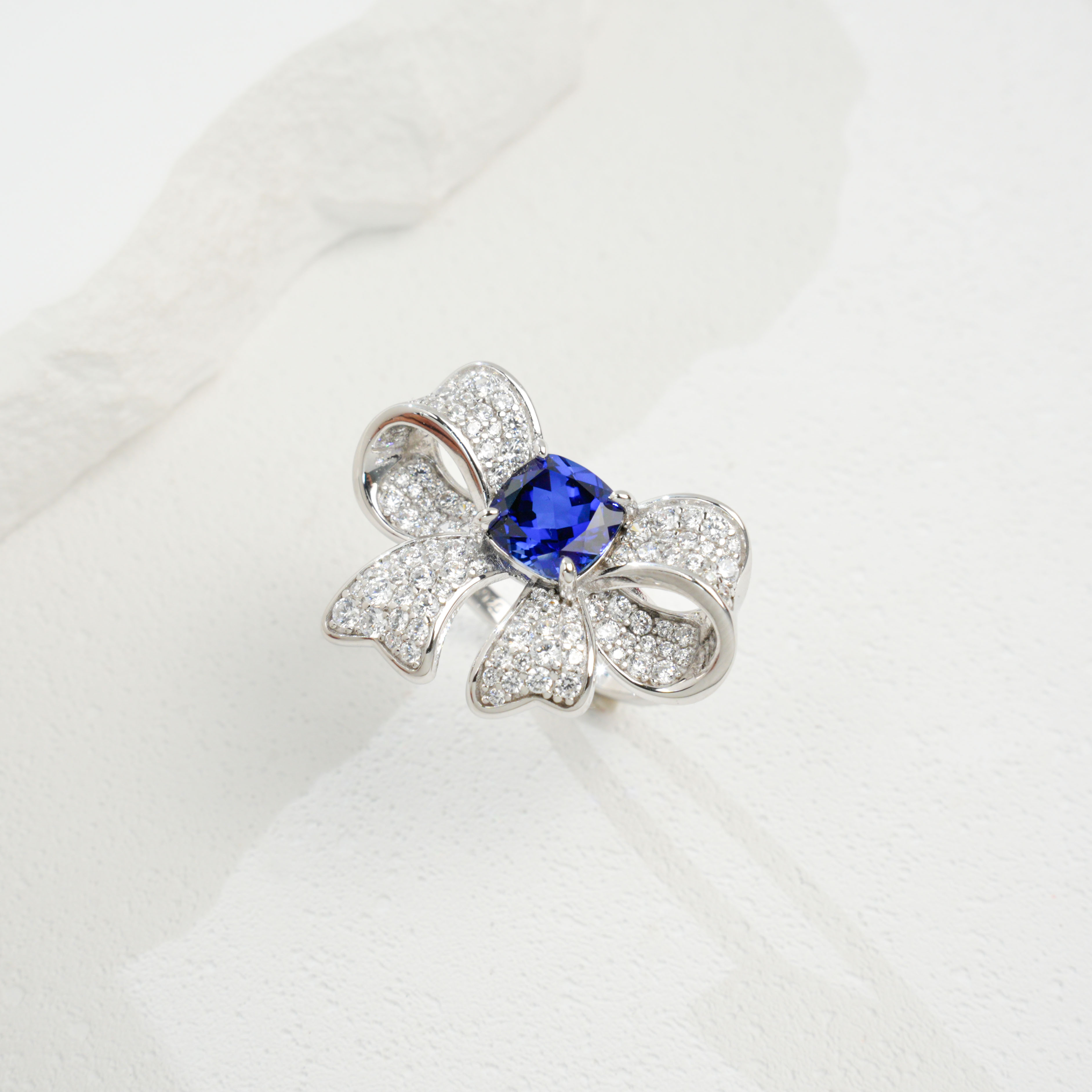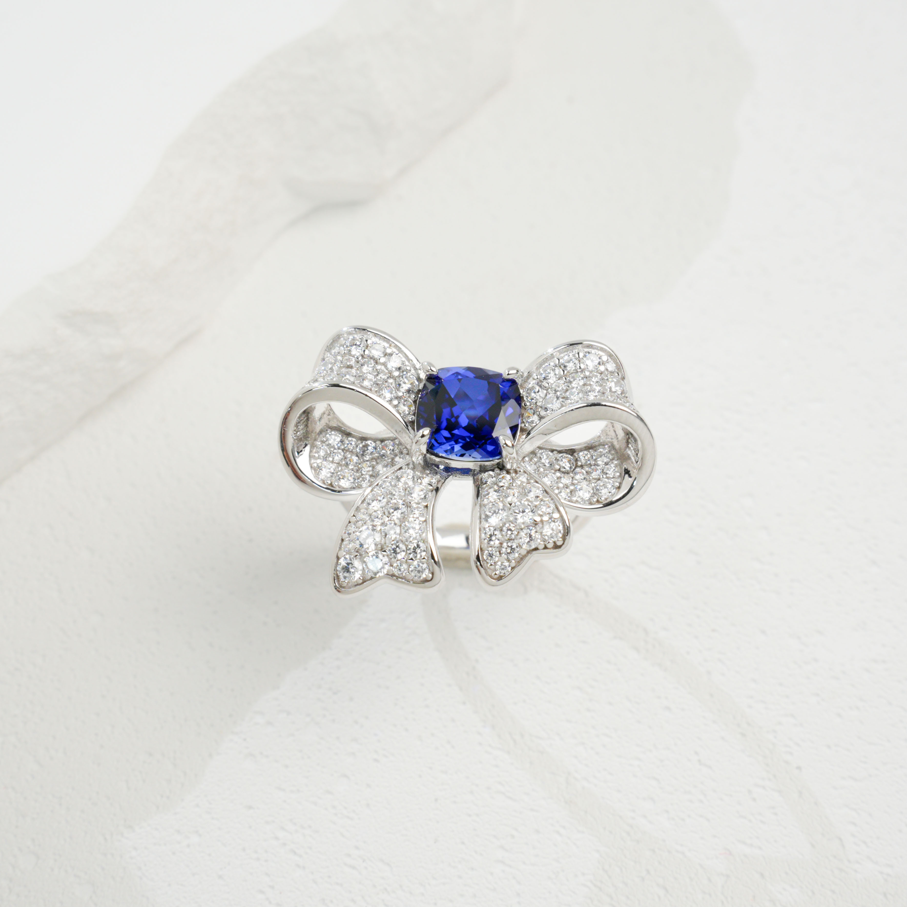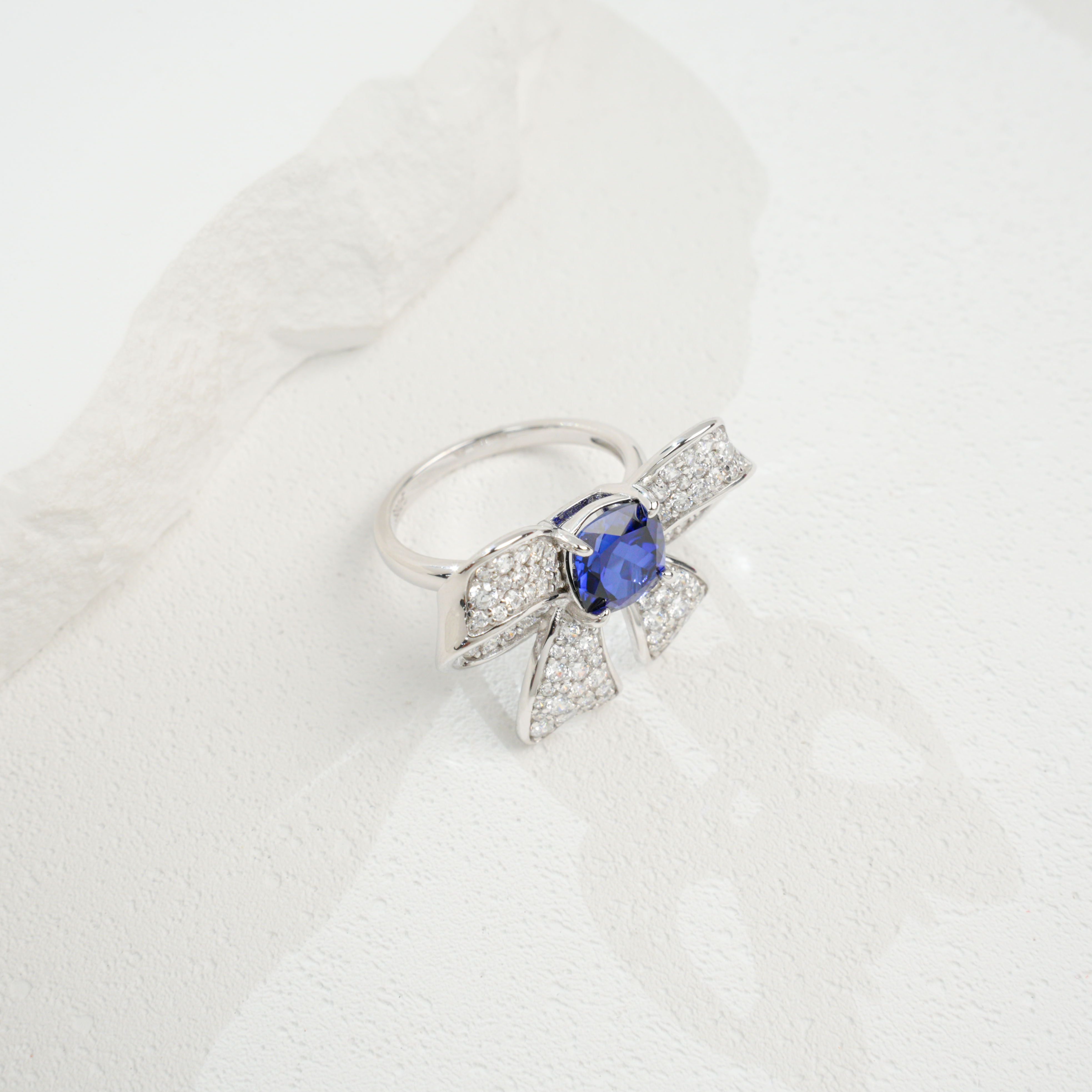 宝石魅力:主石为 7×7MM 培育蓝宝石,公主方切割色泽浓郁深邃,火彩饱满,与满钻蝴蝶结造型形成梦幻组合,复刻天然宝石的高级质感,每一次佩戴都尽显浪漫甜美元素。