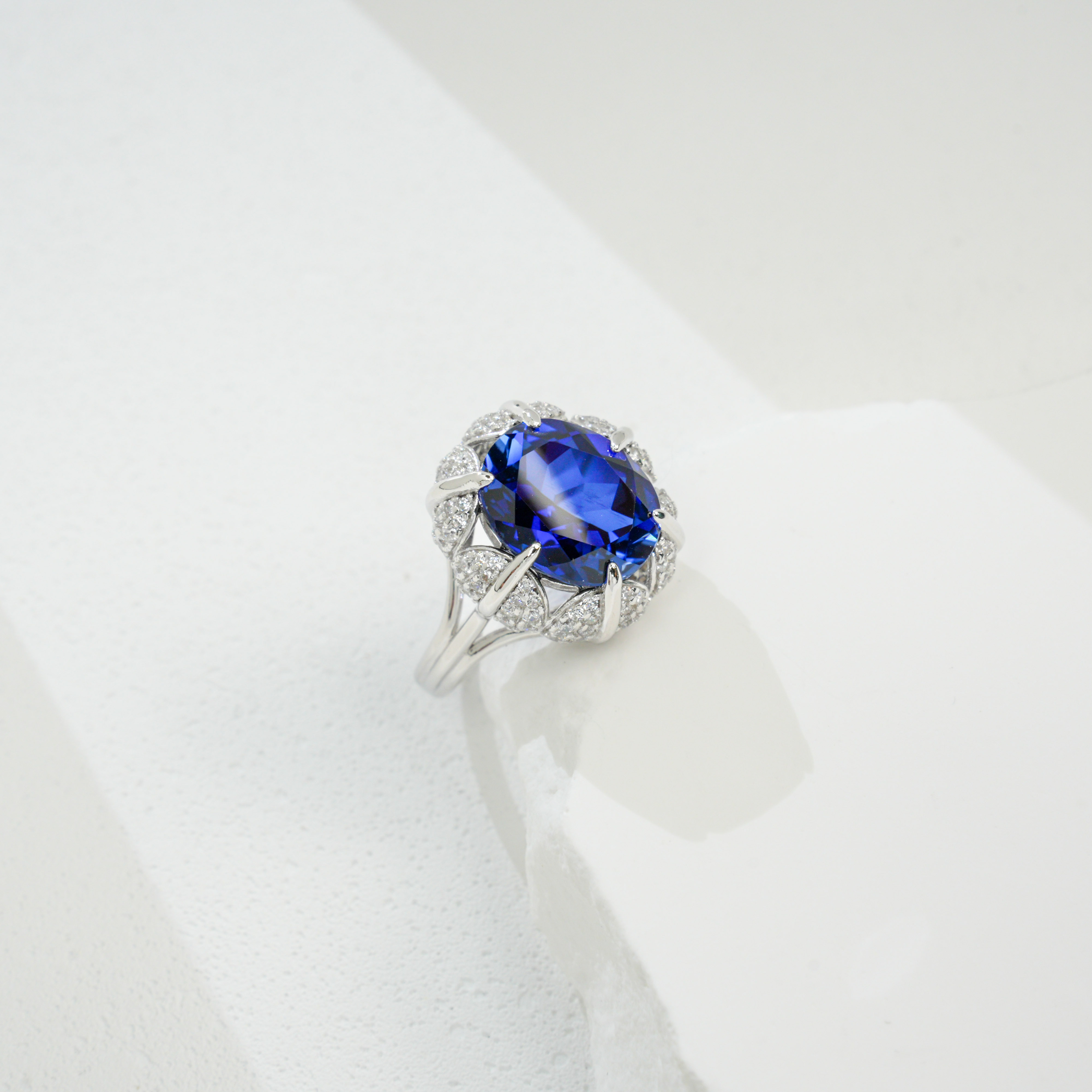 设计巧思:采用艺术花瓣镶钻设计,将椭圆蓝宝的柔美轮廓与钻饰的璀璨光芒融合,小众设计极具辨识度,是指尖的吸睛焦点。
