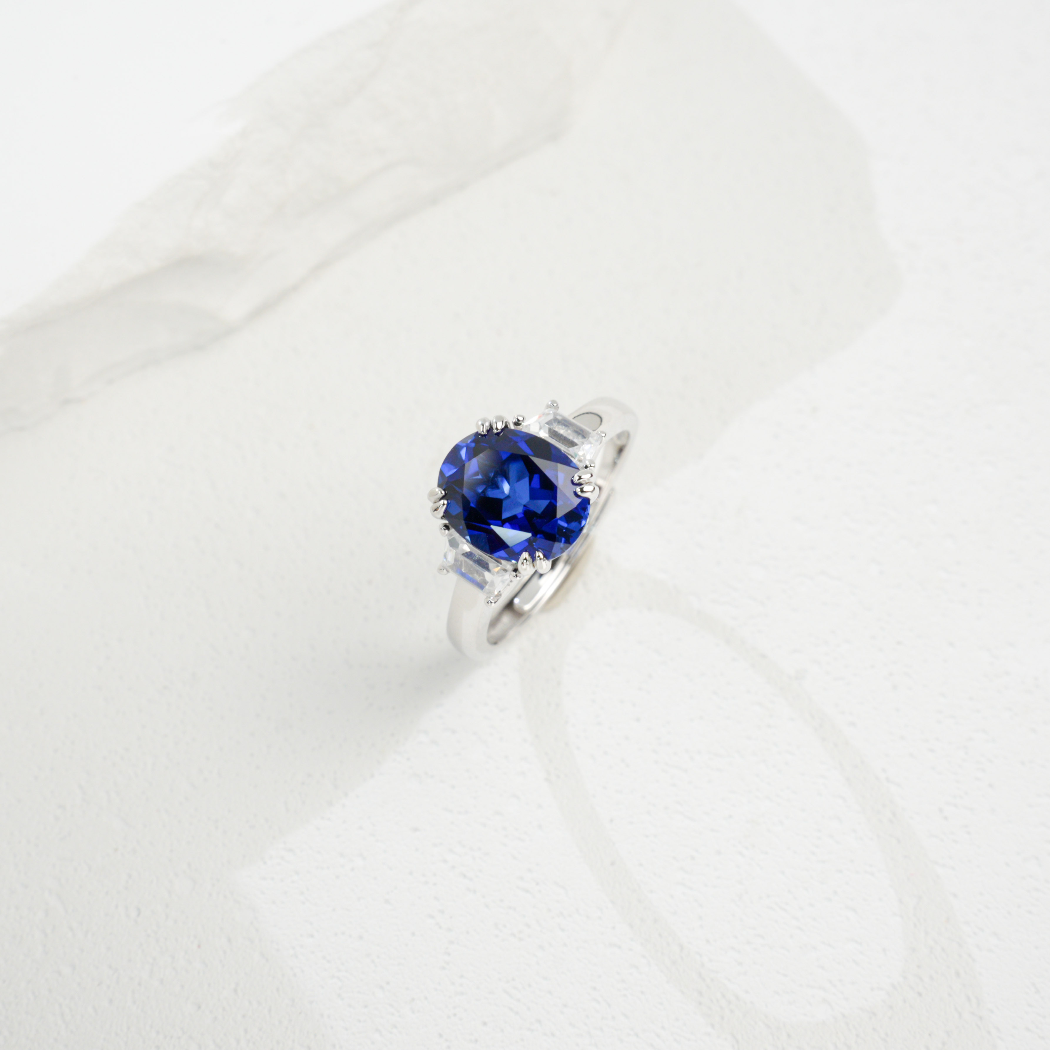 椭圆蓝宝切割工整,三石镶嵌工艺精湛,梯方钻饰与主石交相辉映,让戒指在光线下时刻绽放 “经典轻奢” 的魅力。